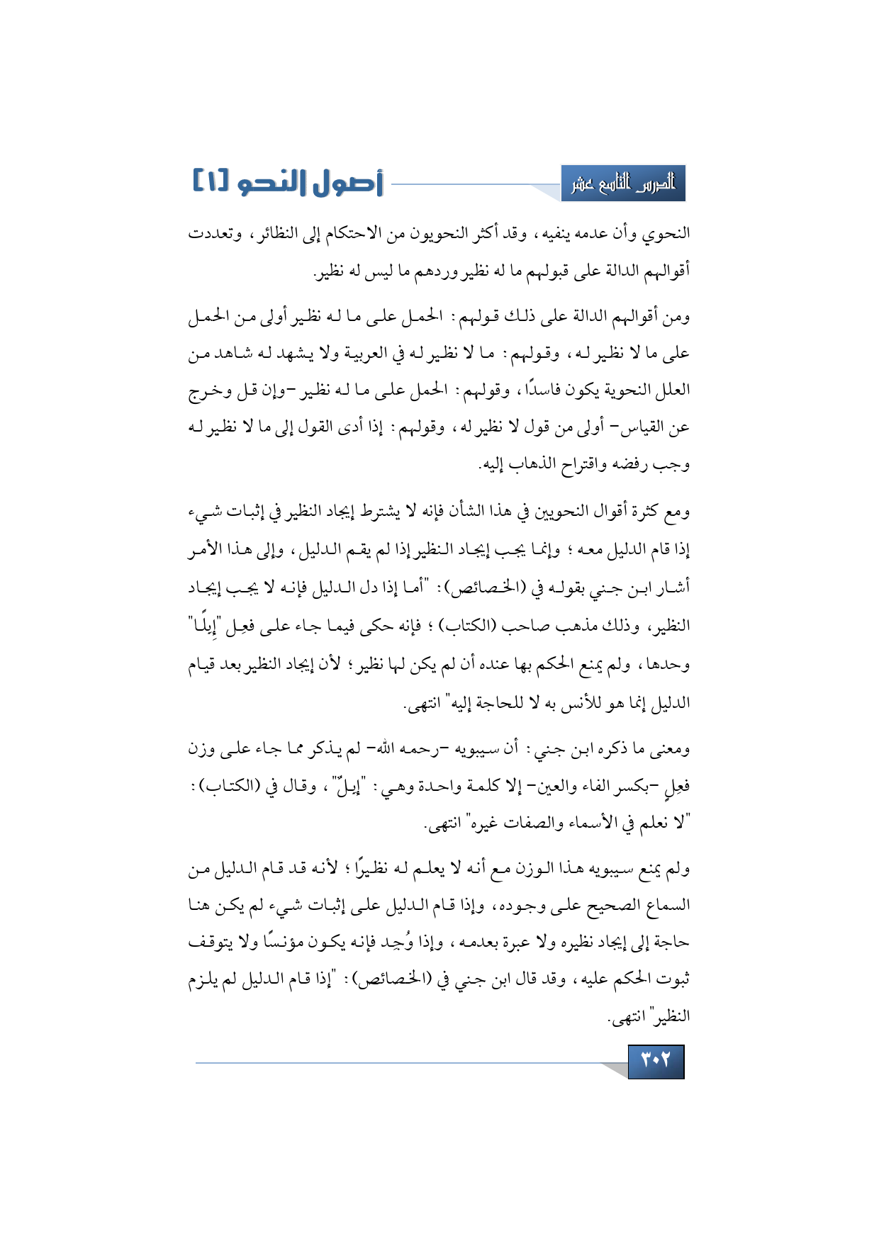 ومن أقوالهم الدالة على ذلك قولهم: الحمل على ما له نظير أولى من الحمل على ما لا نظير له، وقولهم: ما لا نظير له في العربية ولا يشهد له شاهد من العلل النحوية يكون فاسدًا، وقولهم: الحمل على ما له نظير -وإن قل وخرج عن القياس- أولى من قول لا نظير له، وقولهم: إذا أدى القول إلى ما لا نظير له وجب رفضه واقتراح الذهاب إليه.