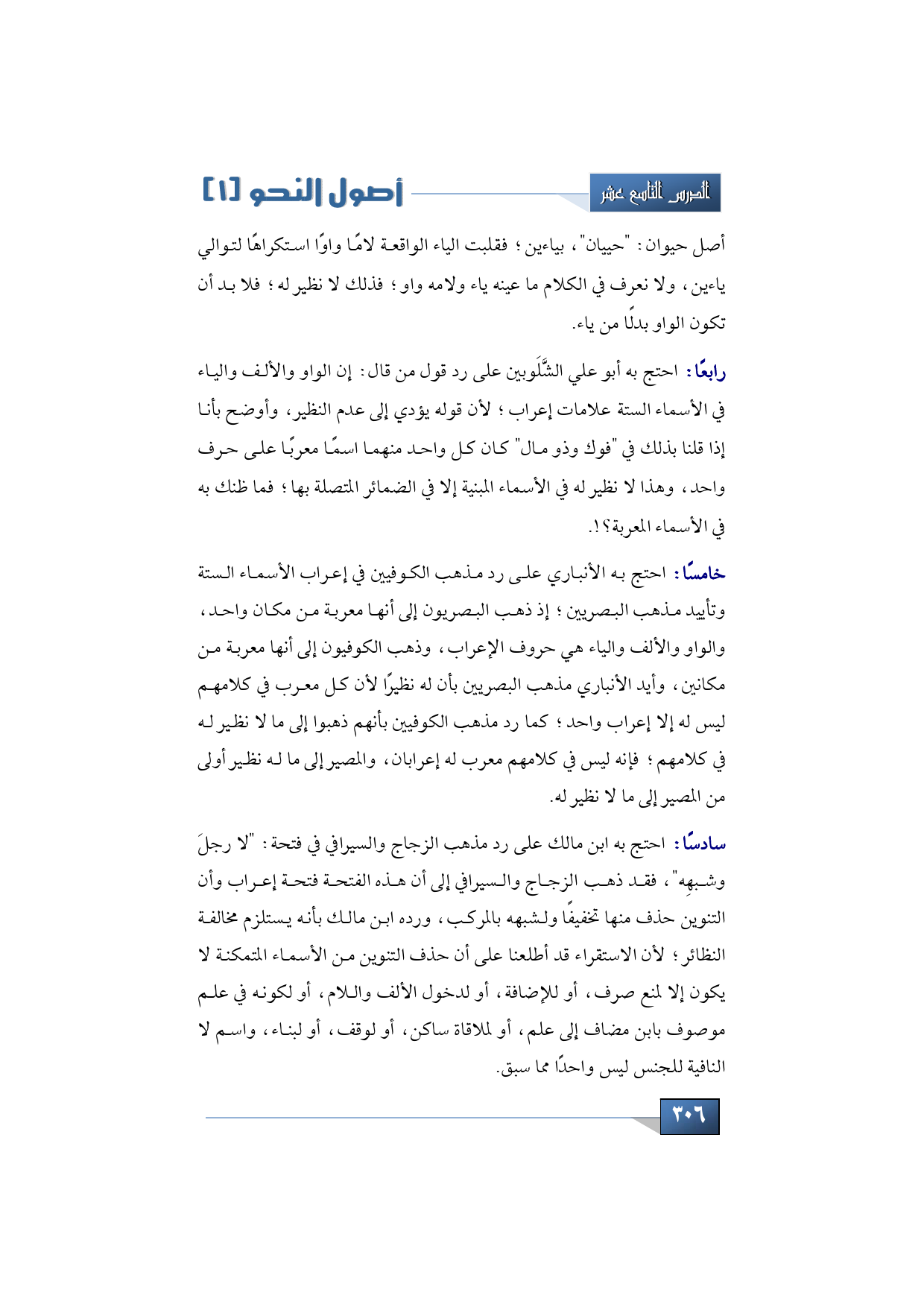 خامسًا: احتج به الأنباري على رد مذهب الكوفيين في إعراب الأسماء الستة وتأييد مذهب البصريين؛ إذ ذهب البصريون إلى أنها معربة من مكان واحد، والواو والألف والياء هي حروف الإعراب، وذهب الكوفيون إلى أنها معربة من مكانين، وأيد الأنباري مذهب البصريين بأن له نظيرًا لأن كل معرب في كلامهم ليس له إلا إعراب واحد؛ كما رد مذهب الكوفيين بأنهم ذهبوا إلى ما لا نظير له في كلامهم؛ فإنه ليس في كلامهم معرب له إعرابان، والمصير إلى ما له نظير أولى من المصير إلى ما لا نظير له.