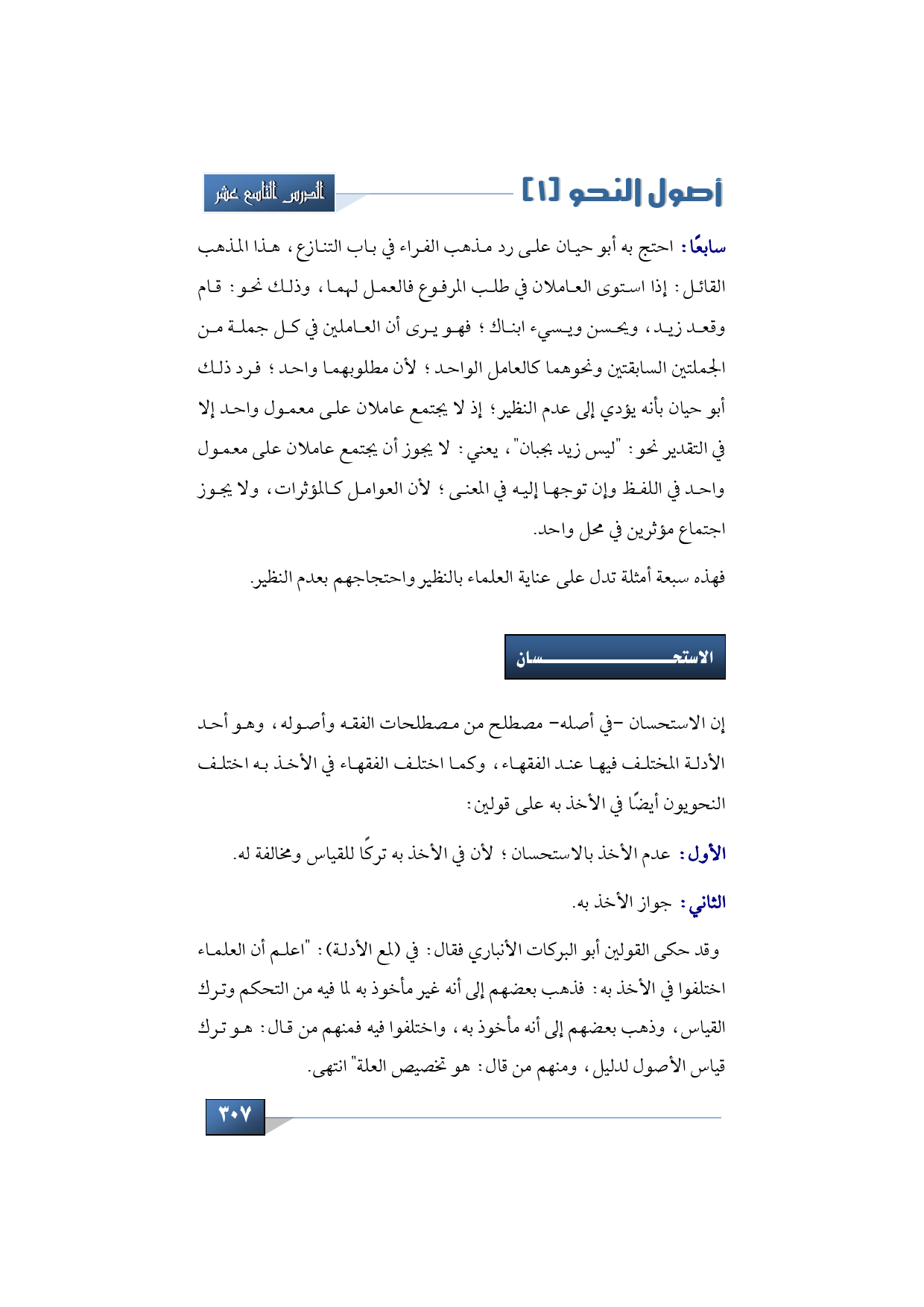 سابعًا: احتج به أبو حيان على رد مذهب الفراء في باب التنازع، هذا المذهب القائل: إذا استوى العاملان في طلب المرفوع فالعمل لهما، وذلك نحو: قام وقعد زيد، ويحسن ويسيء ابناك؛ فهو يرى أن العاملين في كل جملة من الجملتين السابقتين ونحوهما كالعامل الواحد؛ لأن مطلوبهما واحد؛ فرد ذلك أبو حيان بأنه يؤدي إلى عدم النظير؛ إذ لا يجتمع عاملان على معمول واحد إلا في التقدير نحو: "ليس زيد بجبان"، يعني: لا يجوز أن يجتمع عاملان على معمول واحد في اللفظ وإن توجها إليه في المعنى؛ لأن العوامل كالمؤثرات، ولا يجوز اجتماع مؤثرين في محل واحد.