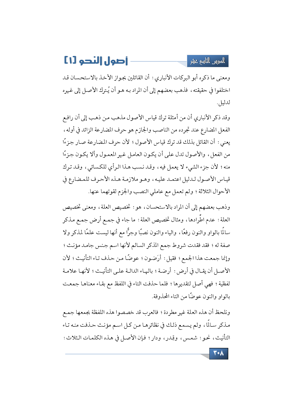 وذهب بعضهم إلى أن المراد بالاستحسان، هو: تخصيص العلة، ومعنى تخصيص العلة: عدم اطِّرادها، ومثال تخصيص العلة: ما جاء في جمع أرض جمع مذكر سالمًا بالواو والنون رفعًا، والياء والنون نصبًا وجرًّا مع أنها ليست علمًا لمذكر ولا صفة له؛ فقد فقدت شروط جمع المذكر السالم لأنها اسم جنس جامد مؤنث؛ وإنما جمعت هذا الجمع؛ فقيل: أرَضون؛ عوضًا من حذف تاء التأنيث؛ لأن الأصل أن يقال في أرض: أرضة؛ بالهاء الدالة على التأنيث؛ لأنها علامة لفظية؛ فهي أصل لتقديرها؛ فلما حذفت التاء في اللفظ مع بقاء معناها جمعت بالواو والنون عوضًا من التاء المحذوفة.