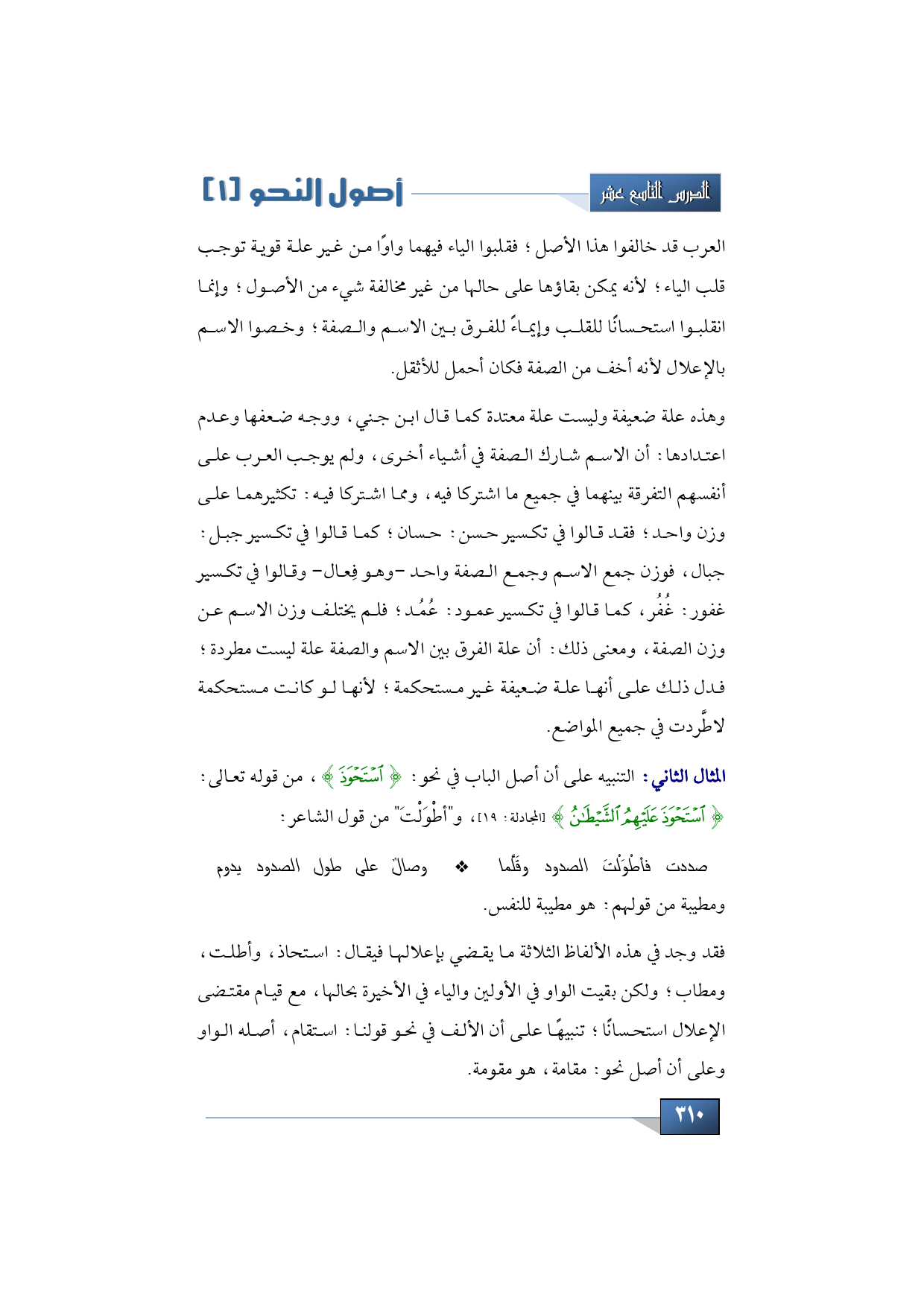 والمثال الثاني: التنبيه على أن أصل الباب في نحو: {اسْتَحْوَذَ}، من قوله تعالى: {اسْتَحْوَذَ عَلَيْهِمُ الشَّيْطَانُ} (المجادلة: 19)، و"أطْوَلْتَ" من قول الشاعر: