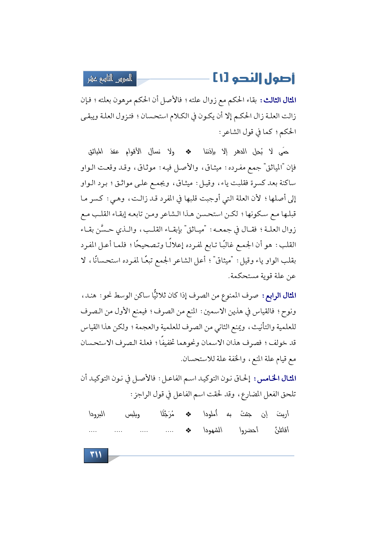 المثال الخامس: إلحاق نون التوكيد اسم الفاعل: فالأصل في نون التوكيد أن تلحق الفعل المضارع، وقد لحقت اسم الفاعل في قول الراجز: