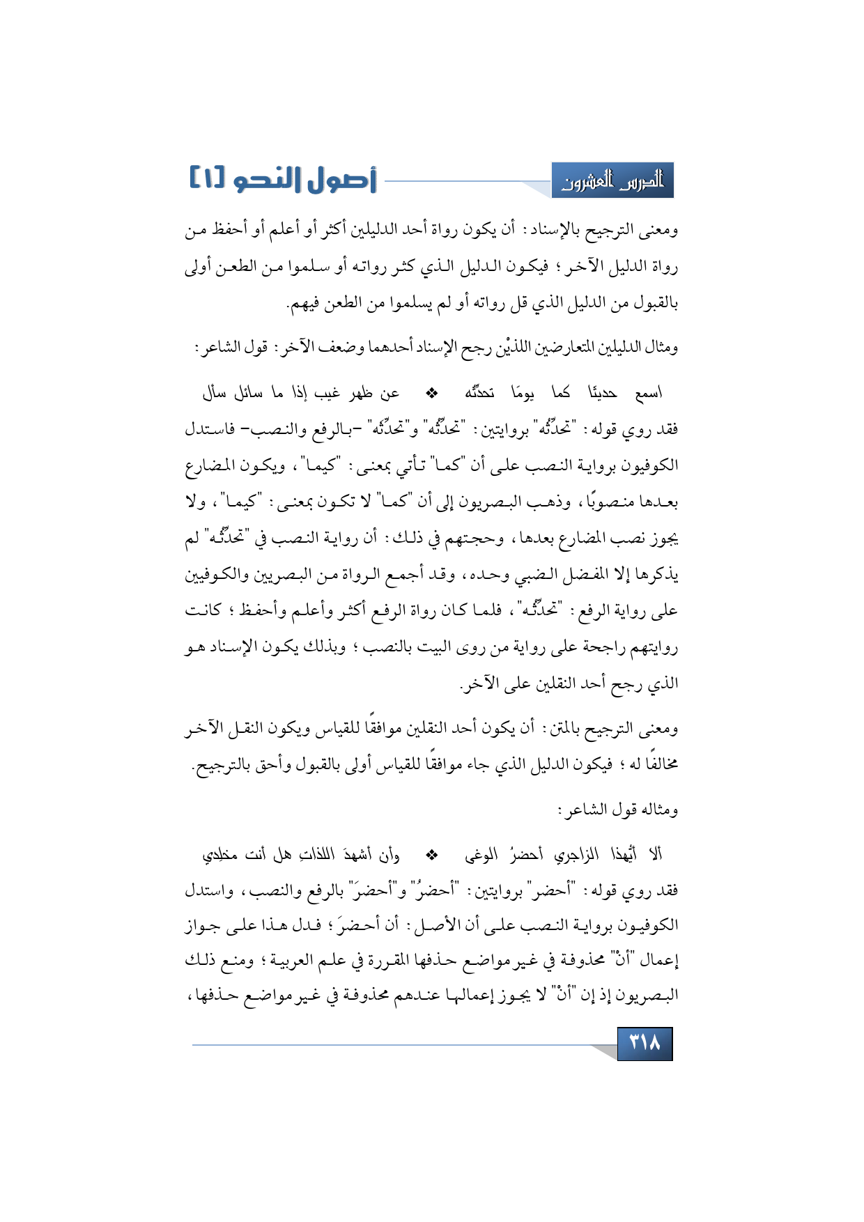 فقد روي قوله: "تحدِّثُه" بروايتين: "تحدِّثُه" و"تحدِّثَه" -بالرفع والنصب- فاستدل الكوفيون برواية النصب على أن "كما" تأتي بمعنى: "كيما"، ويكون المضارع بعدها منصوبًا، وذهب البصريون إلى أن "كما" لا تكون بمعنى: "كيما"، ولا يجوز نصب المضارع بعدها، وحجتهم في ذلك: أن رواية النصب في "تحدِّثُه" لم يذكرها إلا المفضل الضبي وحده، وقد أجمع الرواة من البصريين والكوفيين على رواية الرفع: "تحدِّثُه"، فلما كان رواة الرفع أكثر وأعلم وأحفظ؛ كانت روايتهم راجحة على رواية من روى البيت بالنصب؛ وبذلك يكون الإسناد هو الذي رجح أحد النقلين على الآخر.