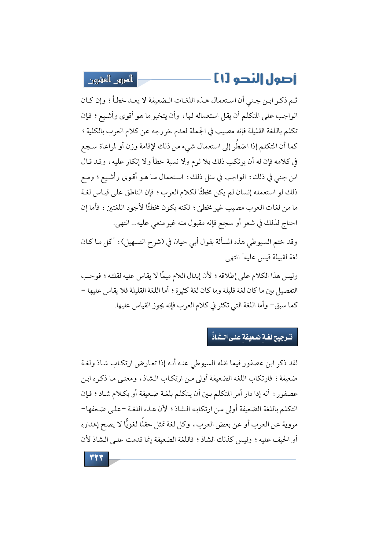 لقد ذكر ابن عصفور فيما نقله السيوطي عنه أنه إذا تعارض ارتكاب شاذ ولغة ضعيفة؛ فارتكاب اللغة الضعيفة أولى من ارتكاب الشاذ، ومعنى ما ذكره ابن عصفور: أنه إذا دار أمر المتكلم بين أن يتكلم بلغة ضعيفة أو بكلام شاذ؛ فإن التكلم باللغة الضعيفة أولى من ارتكابه الشاذ؛ لأن هذه اللغة -على ضعفها- مروية عن العرب أو عن بعض العرب، وكل لغة تمثل حقلًا لغويًّا لا يصح إهداره أو الحيف عليه؛ وليس كذلك الشاذ؛ فاللغة الضعيفة إنما قدمت على الشاذ لأن