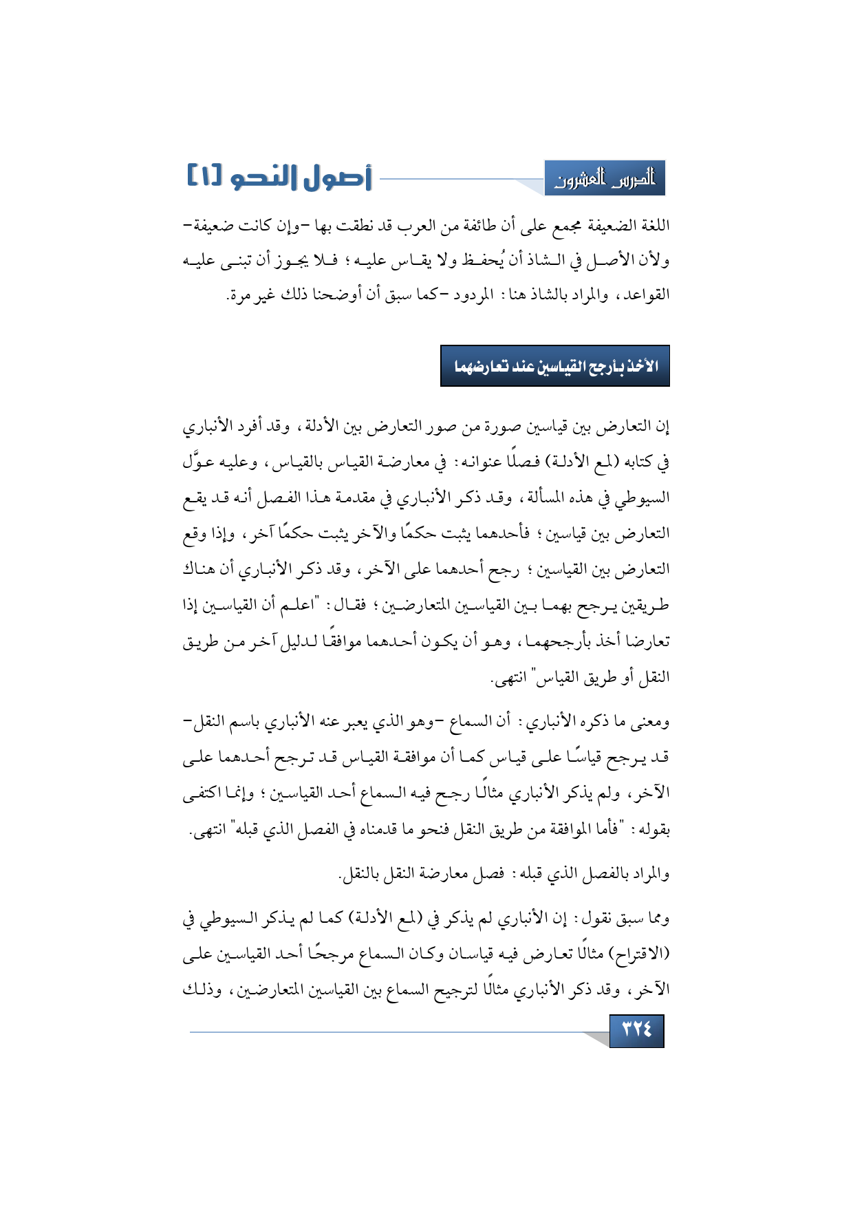ومعنى ما ذكره الأنباري: أن السماع -وهو الذي يعبر عنه الأنباري باسم النقل- قد يرجح قياسًا على قياس كما أن موافقة القياس قد ترجح أحدهما على الآخر، ولم يذكر الأنباري مثالًا رجح فيه السماع أحد القياسين؛ وإنما اكتفى بقوله: "فأما الموافقة من طريق النقل فنحو ما قدمناه في الفصل الذي قبله" انتهى.