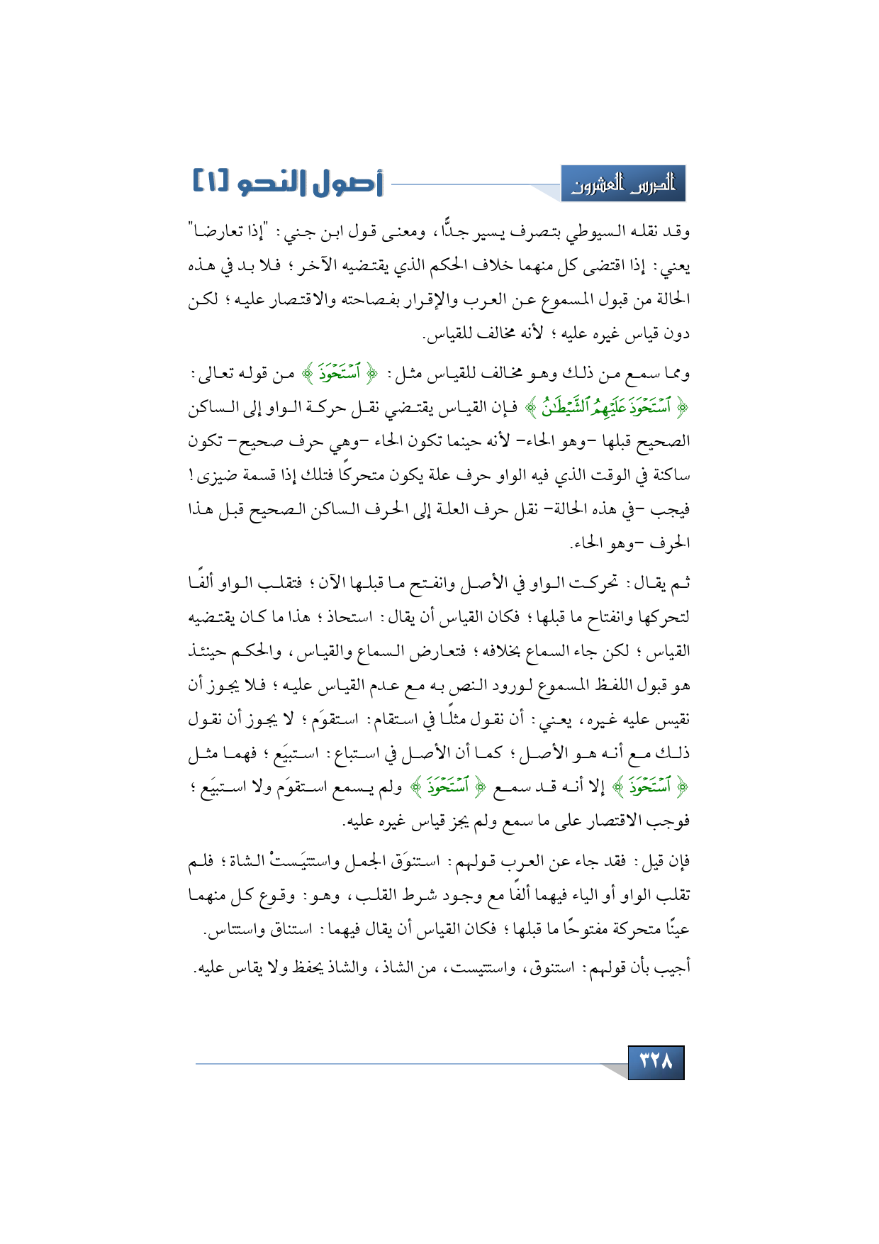 ثم يقال: تحركت الواو في الأصل وانفتح ما قبلها الآن؛ فتقلب الواو ألفًا لتحركها وانفتاح ما قبلها؛ فكان القياس أن يقال: استحاذ؛ هذا ما كان يقتضيه القياس؛ لكن جاء السماع بخلافه؛ فتعارض السماع والقياس، والحكم حينئذ هو قبول اللفظ المسموع لورود النص به مع عدم القياس عليه؛ فلا يجوز أن نقيس عليه غيره، يعني: أن نقول مثلًا في استقام: استقوَم؛ لا يجوز أن نقول ذلك مع أنه هو الأصل؛ كما أن الأصل في استباع: استبيَع؛ فهما مثل {اسْتَحْوَذَ} إلا أنه قد سمع {اسْتَحْوَذَ} ولم يسمع استقوَم ولا استبيَع؛ فوجب الاقتصار على ما سمع ولم يجز قياس غيره عليه.