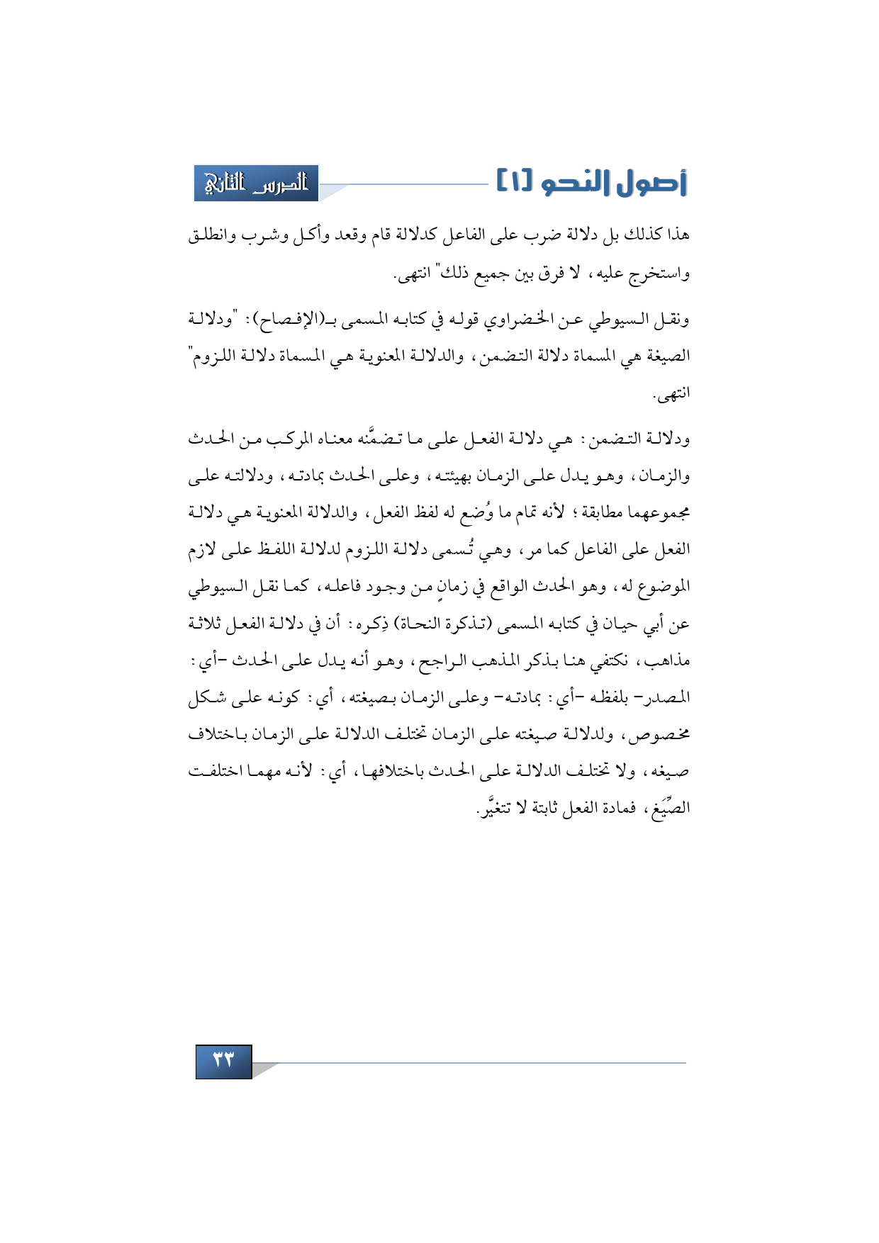 ودلالة التضمن: هي دلالة الفعل على ما تضمَّنه معناه المركب من الحدث والزمان، وهو يدل على الزمان بهيئته، وعلى الحدث بمادته، ودلالته على مجموعهما مطابقة؛ لأنه تمام ما وُضع له لفظ الفعل، والدلالة المعنوية هي دلالة الفعل على الفاعل كما مر، وهي تُسمى دلالة اللزوم لدلالة اللفظ على لازم الموضوع له، وهو الحدث الواقع في زمانٍ من وجود فاعله، كما نقل السيوطي عن أبي حيان في كتابه المسمى (تذكرة النحاة) ذِكره: أن في دلالة الفعل ثلاثة مذاهب، نكتفي هنا بذكر المذهب الراجح، وهو أنه يدل على الحدث -أي: المصدر- بلفظه -أي: بمادته- وعلى الزمان بصيغته، أي: كونه على شكل مخصوص، ولدلالة صيغته على الزمان تختلف الدلالة على الزمان باختلاف صيغه، ولا تختلف الدلالة على الحدث باختلافها، أي: لأنه مهما اختلفت الصِّيَغ، فمادة الفعل ثابتة لا تتغيَّر.