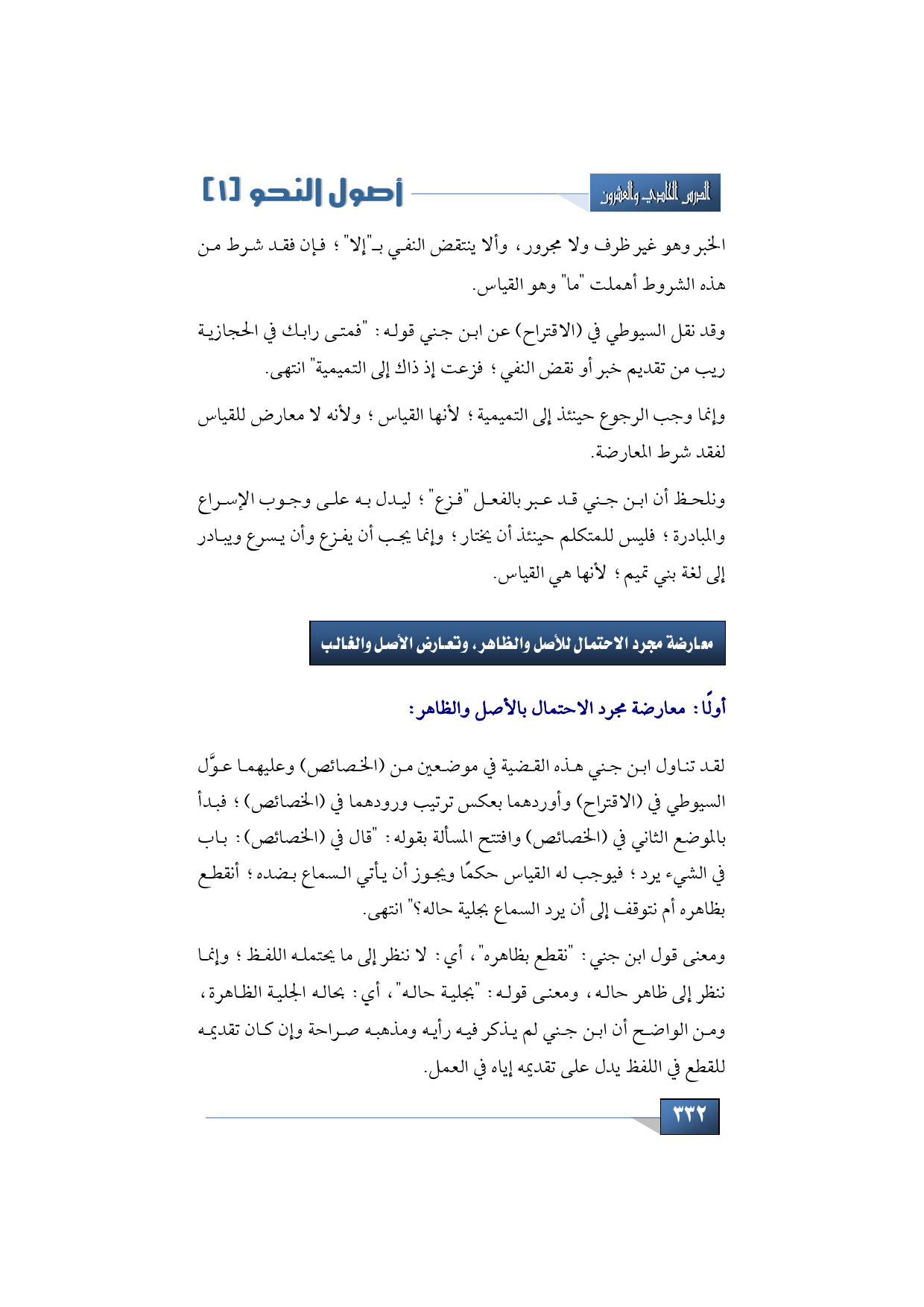 لقد تناول ابن جني هذه القضية في موضعين من (الخصائص) وعليهما عوَّل السيوطي في (الاقتراح) وأوردهما بعكس ترتيب ورودهما في (الخصائص)؛ فبدأ بالموضع الثاني في (الخصائص) وافتتح المسألة بقوله: "قال في (الخصائص): باب في الشيء يرد؛ فيوجب له القياس حكمًا ويجوز أن يأتي السماع بضده؛ أنقطع بظاهره أم نتوقف إلى أن يرد السماع بجلية حاله؟ " انتهى.