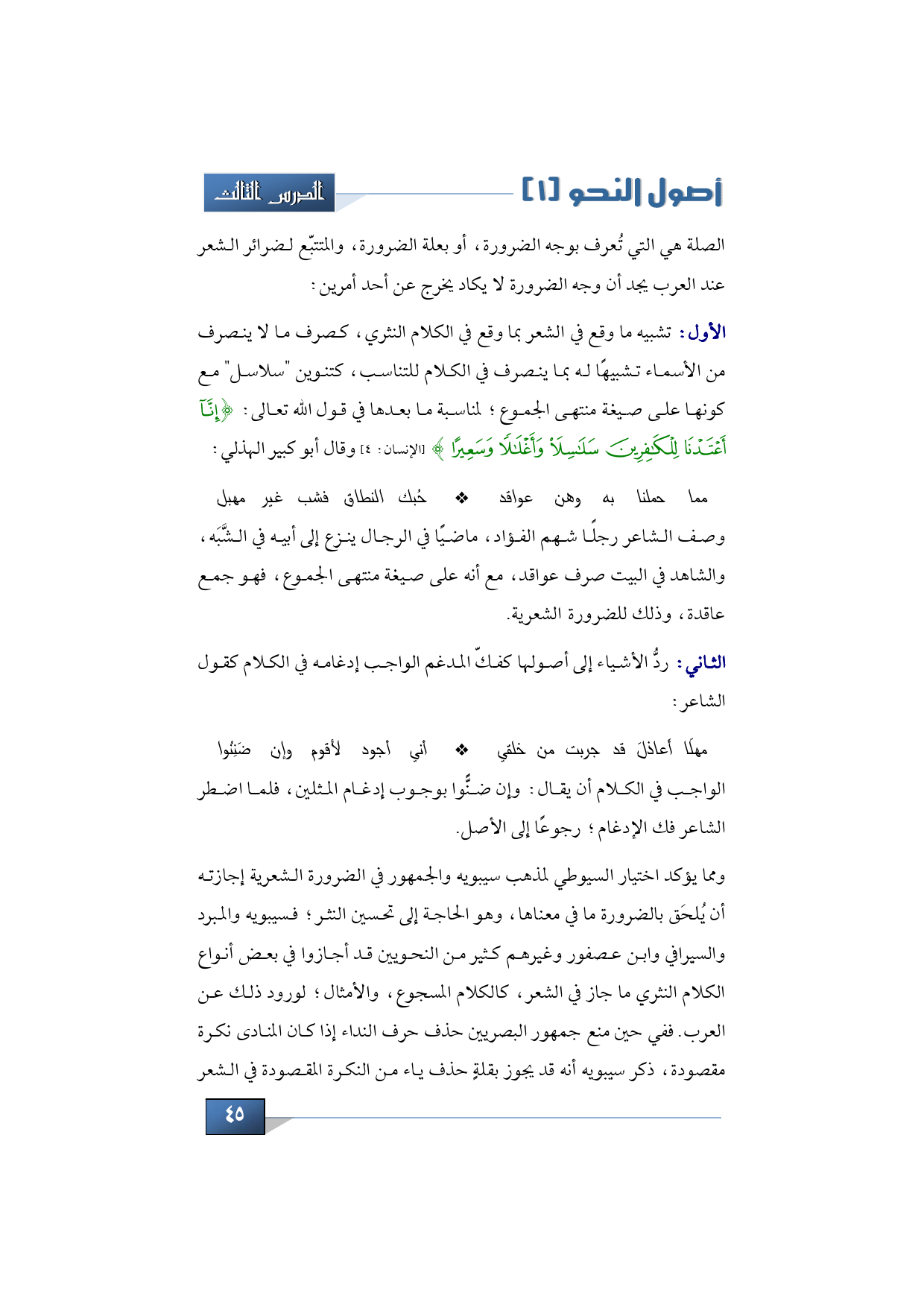 الأول: تشبيه ما وقع في الشعر بما وقع في الكلام النثري، كصرف ما لا ينصرف من الأسماء تشبيهًا له بما ينصرف في الكلام للتناسب، كتنوين "سلاسل" مع كونها على صيغة منتهى الجموع؛ لمناسبة ما بعدها في قول الله تعالى: {إِنَّا أَعْتَدْنَا لِلْكَافِرِينَ سَلَاسِلَا وَأَغْلَالًا وَسَعِيرًا} (الإنسان: 4) وقال أبو كبير الهذلي: