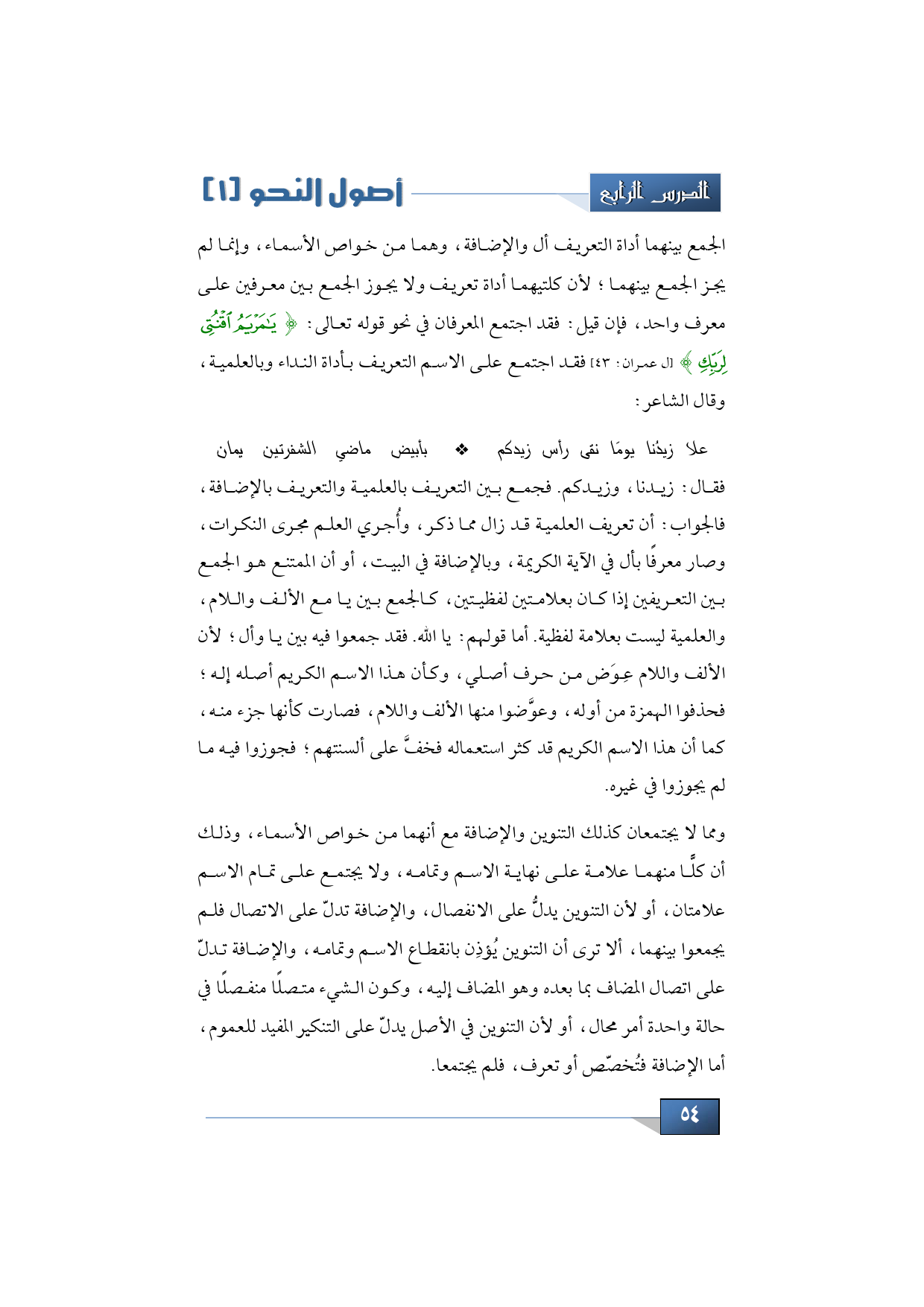 فقال: زيدنا، وزيدكم. فجمع بين التعريف بالعلمية والتعريف بالإضافة، فالجواب: أن تعريف العلمية قد زال مما ذكر، وأُجري العلم مجرى النكرات، وصار معرفًا بأل في الآية الكريمة، وبالإضافة في البيت، أو أن الممتنع هو الجمع بين التعريفين إذا كان بعلامتين لفظيتين، كالجمع بين يا مع الألف واللام، والعلمية ليست بعلامة لفظية. أما قولهم: يا الله. فقد جمعوا فيه بين يا وأل؛ لأن الألف واللام عِوَض من حرف أصلي، وكأن هذا الاسم الكريم أصله إله؛ فحذفوا الهمزة من أوله، وعوَّضوا منها الألف واللام، فصارت كأنها جزء منه، كما أن هذا الاسم الكريم قد كثر استعماله فخفَّ على ألسنتهم؛ فجوزوا فيه ما لم يجوزوا في غيره.