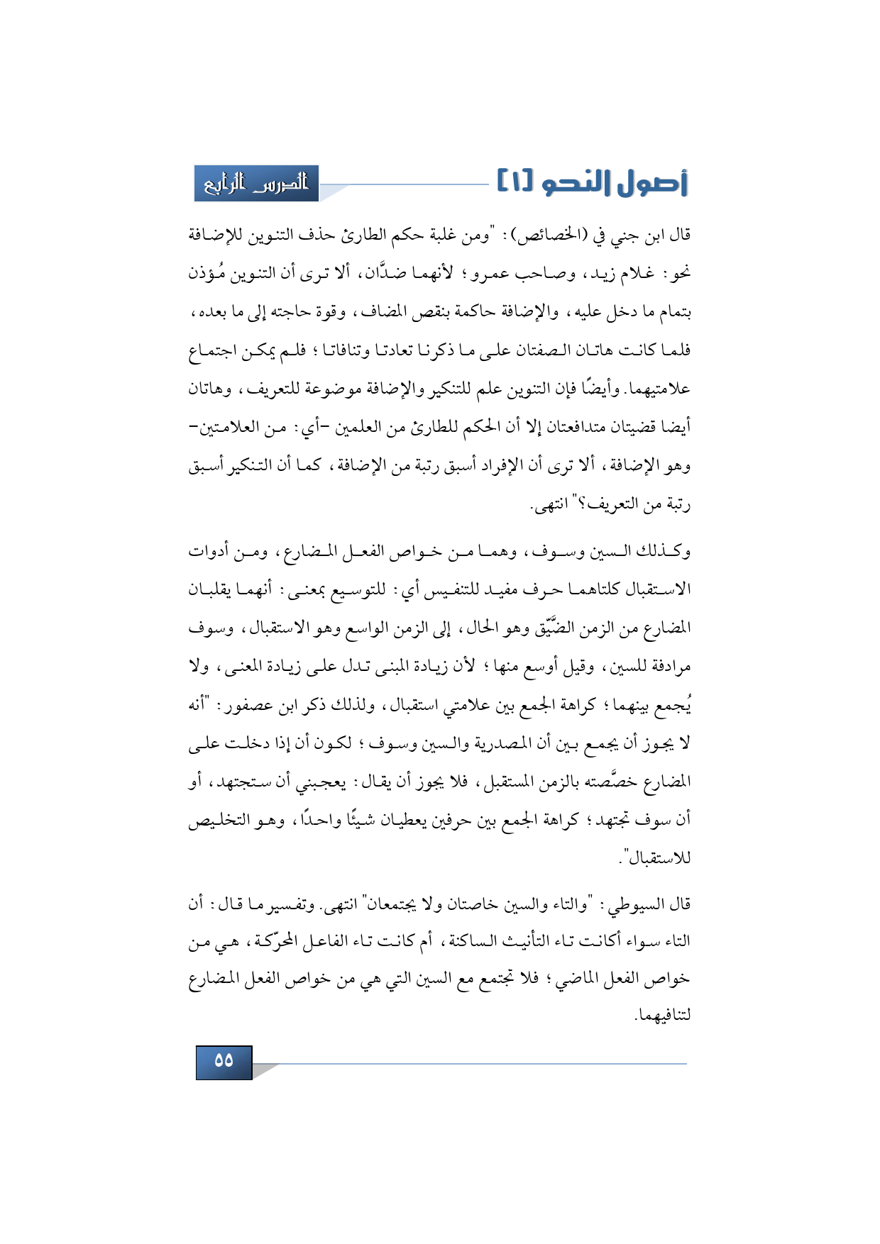 وكذلك السين وسوف، وهما من خواص الفعل المضارع، ومن أدوات الاستقبال كلتاهما حرف مفيد للتنفيس أي: للتوسيع بمعنى: أنهما يقلبان المضارع من الزمن الضَّيّق وهو الحال، إلى الزمن الواسع وهو الاستقبال، وسوف مرادفة للسين، وقيل أوسع منها؛ لأن زيادة المبنى تدل على زيادة المعنى، ولا يُجمع بينهما؛ كراهة الجمع بين علامتي استقبال، ولذلك ذكر ابن عصفور: "أنه لا يجوز أن يجمع بين أن المصدرية والسين وسوف؛ لكون أن إذا دخلت على المضارع خصَّصته بالزمن المستقبل، فلا يجوز أن يقال: يعجبني أن ستجتهد، أو أن سوف تجتهد؛ كراهة الجمع بين حرفين يعطيان شيئًا واحدًا، وهو التخليص للاستقبال".