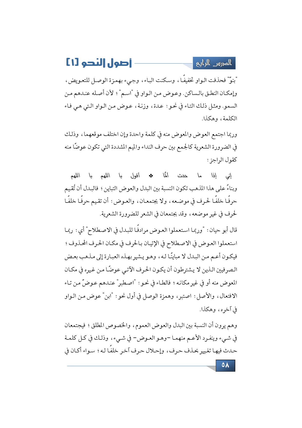 "بنوٌ" فحذفت الواو تخفيفًا، وسكنت الباء، وجيء بهمزة الوصل للتعويض، وإمكان النطق بالساكن. وعوض من الواو في "اسم"؛ لأن أصله عندهم من السمو. ومثل ذلك التاء في نحو: عدة، وزنة، عوض من الواو التي هي فاء الكلمة، وهكذا.