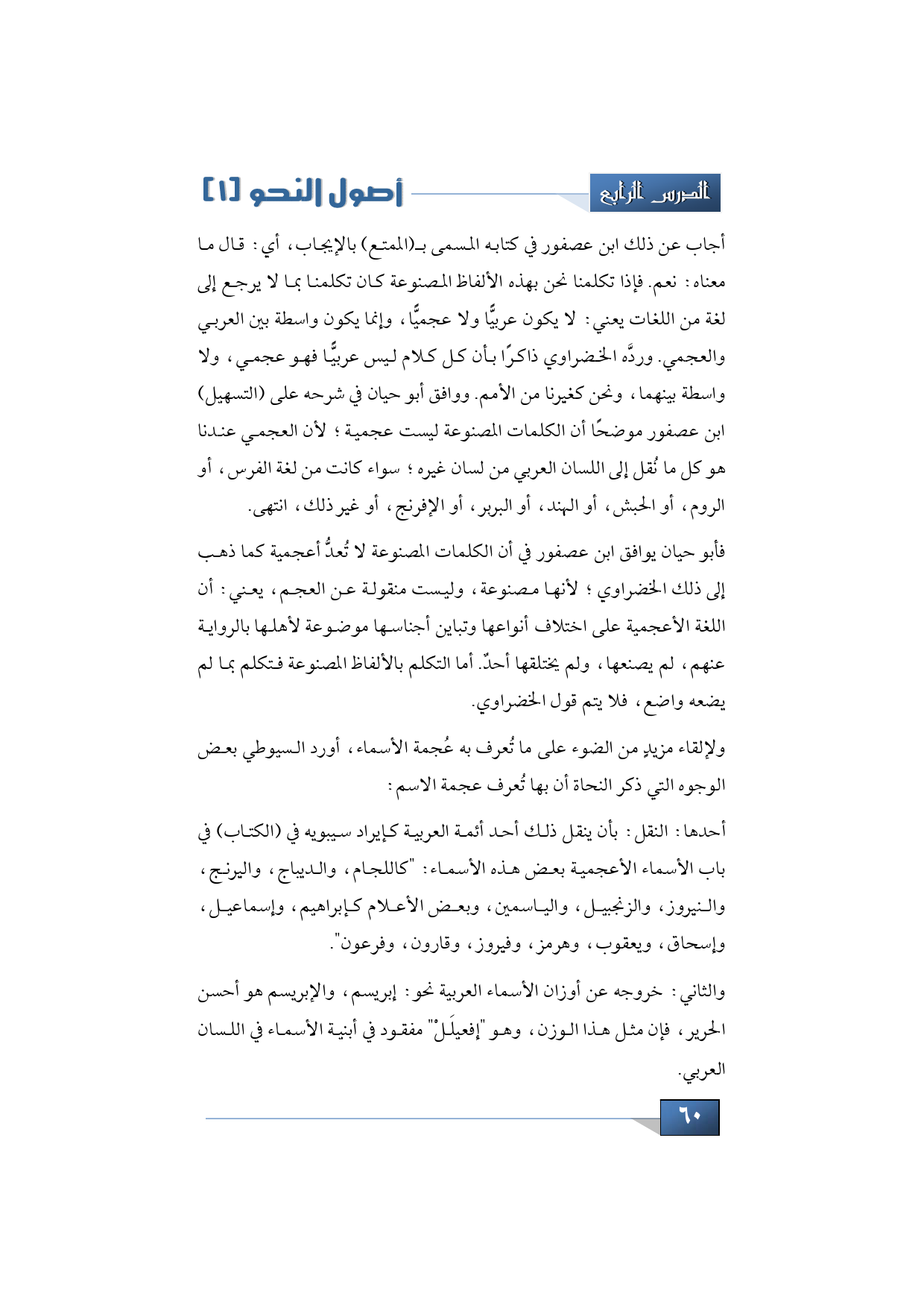 فأبو حيان يوافق ابن عصفور في أن الكلمات المصنوعة لا تُعدُّ أعجمية كما ذهب إلى ذلك الخضراوي؛ لأنها مصنوعة، وليست منقولة عن العجم، يعني: أن اللغة الأعجمية على اختلاف أنواعها وتباين أجناسها موضوعة لأهلها بالرواية عنهم، لم يصنعها، ولم يختلقها أحدٌ. أما التكلم بالألفاظ المصنوعة فتكلم بما لم يضعه واضع، فلا يتم قول الخضراوي.