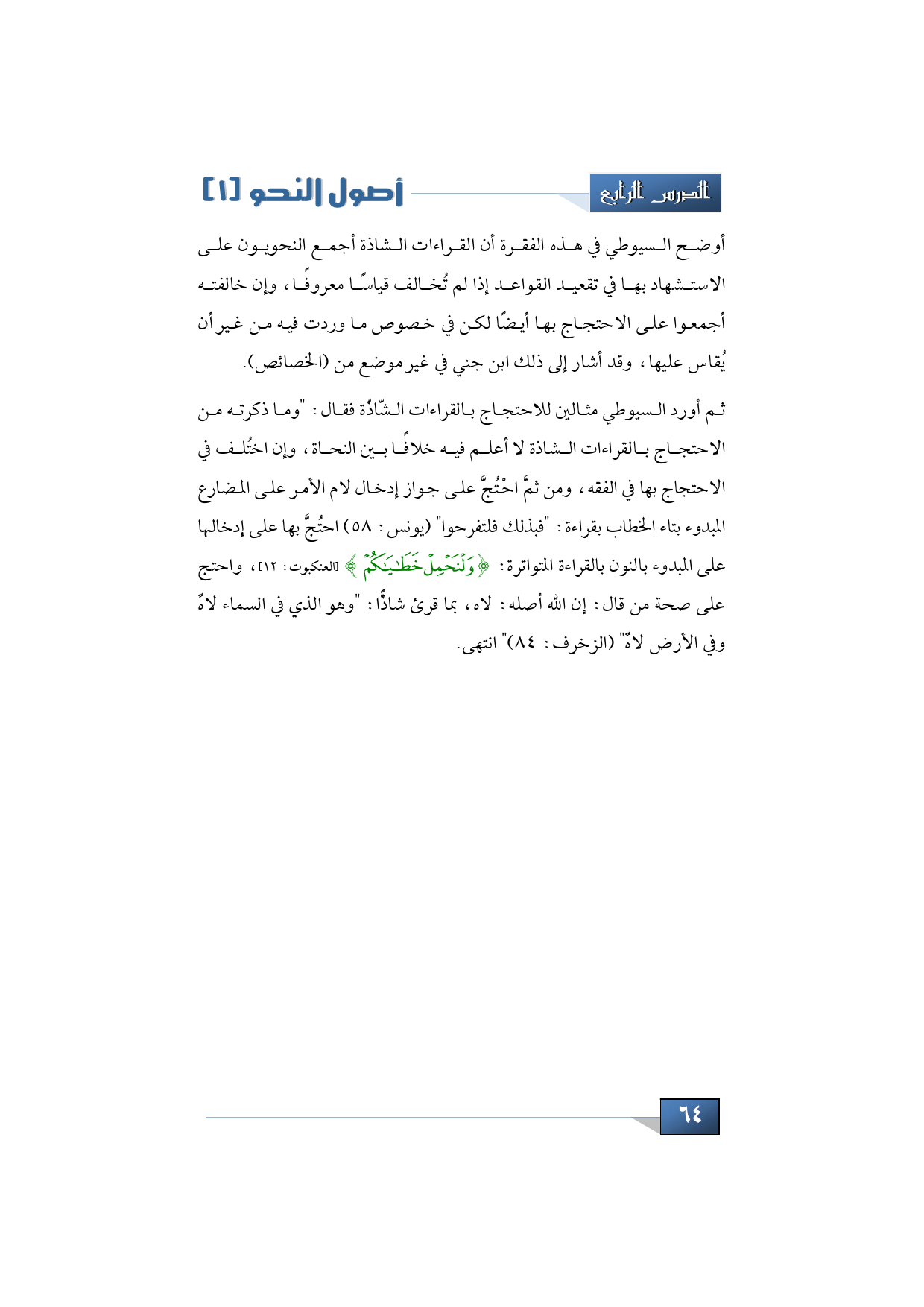 ثم أورد السيوطي مثالين للاحتجاج بالقراءات الشّاذّة فقال: "وما ذكرته من الاحتجاج بالقراءات الشاذة لا أعلم فيه خلافًا بين النحاة، وإن اختُلف في الاحتجاج بها في الفقه، ومن ثمَّ احْتُجَّ على جواز إدخال لام الأمر على المضارع المبدوء بتاء الخطاب بقراءة: "فبذلك فلتفرحوا" (يونس: 58) احتُجَّ بها على إدخالها على المبدوء بالنون بالقراءة المتواترة: {وَلْنَحْمِلْ خَطَايَاكُمْ} (العنكبوت: 12)، واحتج على صحة من قال: إن الله أصله: لاه، بما قرئ شاذًّا: "وهو الذي في السماء لاهٌ وفي الأرض لاهٌ" (الزخرف: 84) " انتهى.