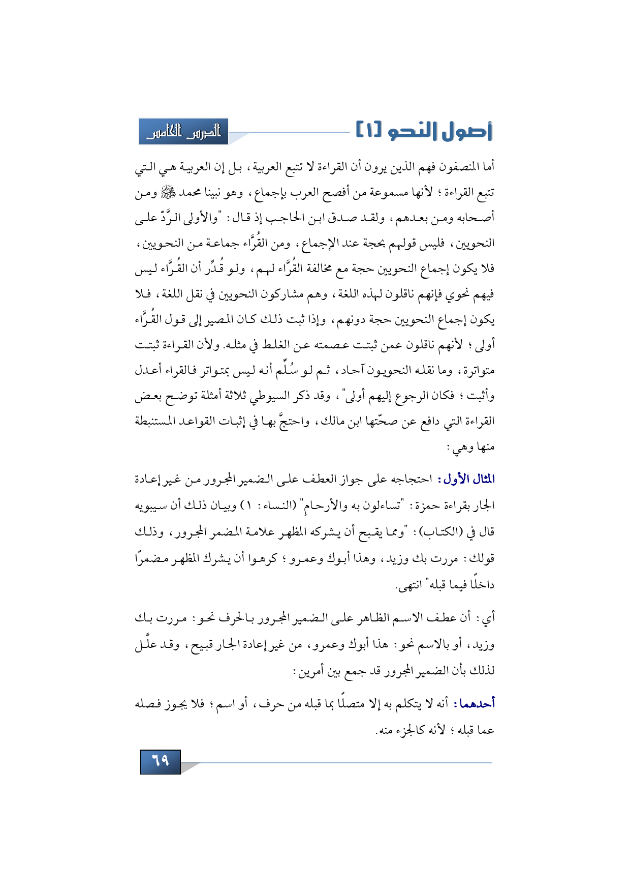 المثال الأول: احتجاجه على جواز العطف على الضمير المجرور من غير إعادة الجار بقراءة حمزة: "تساءلون به والأرحامِ" (النساء: 1) وبيان ذلك أن سيبويه قال في (الكتاب): "ومما يقبح أن يشركه المظهر علامة المضمر المجرور، وذلك قولك: مررت بك وزيد، وهذا أبوك وعمرو؛ كرهوا أن يشرك المظهر مضمرًا داخلًا فيما قبله" انتهى.