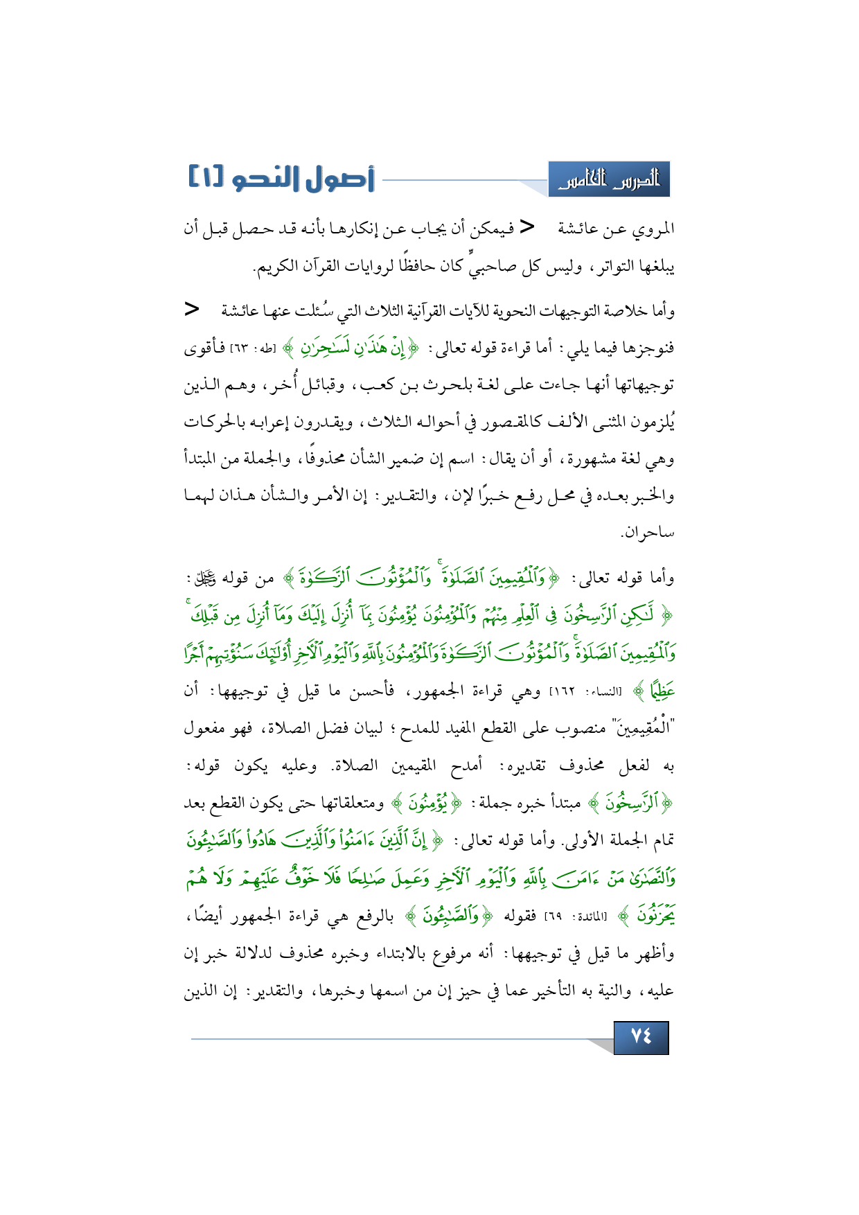 وأما خلاصة التوجيهات النحوية للآيات القرآنية الثلاث التي سُئلت عنها عائشة -رضي الله عنها- فنوجزها فيما يلي: أما قراءة قوله تعالى: {إِنْ هَذَانِ لَسَاحِرَانِ} (طه: 63) فأقوى توجيهاتها أنها جاءت على لغة بلحرث بن كعب، وقبائل أُخر، وهم الذين يُلزمون المثنى الألف كالمقصور في أحواله الثلاث، ويقدرون إعرابه بالحركات وهي لغة مشهورة، أو أن يقال: اسم إن ضمير الشأن محذوفًا، والجملة من المبتدأ والخبر بعده في محل رفع خبرًا لإن، والتقدير: إن الأمر والشأن هذان لهما ساحران.