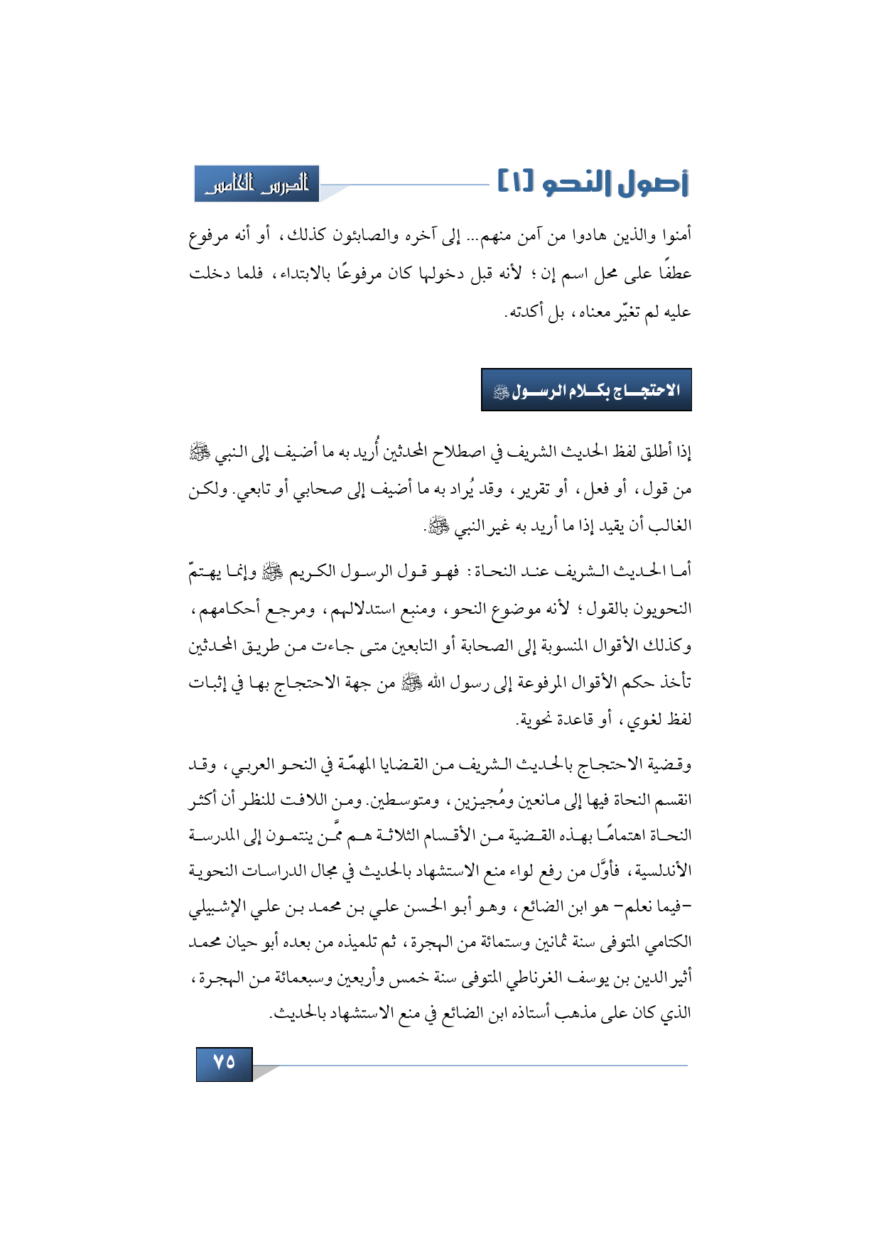 وقضية الاحتجاج بالحديث الشريف من القضايا المهمّة في النحو العربي، وقد انقسم النحاة فيها إلى مانعين ومُجيزين، ومتوسطين. ومن اللافت للنظر أن أكثر النحاة اهتمامًا بهذه القضية من الأقسام الثلاثة هم ممَّن ينتمون إلى المدرسة الأندلسية، فأوَّل من رفع لواء منع الاستشهاد بالحديث في مجال الدراسات النحوية -فيما نعلم- هو ابن الضائع، وهو أبو الحسن علي بن محمد بن علي الإشبيلي الكتامي المتوفى سنة ثمانين وستمائة من الهجرة، ثم تلميذه من بعده أبو حيان محمد أثير الدين بن يوسف الغرناطي المتوفى سنة خمس وأربعين وسبعمائة من الهجرة، الذي كان على مذهب أستاذه ابن الضائع في منع الاستشهاد بالحديث.