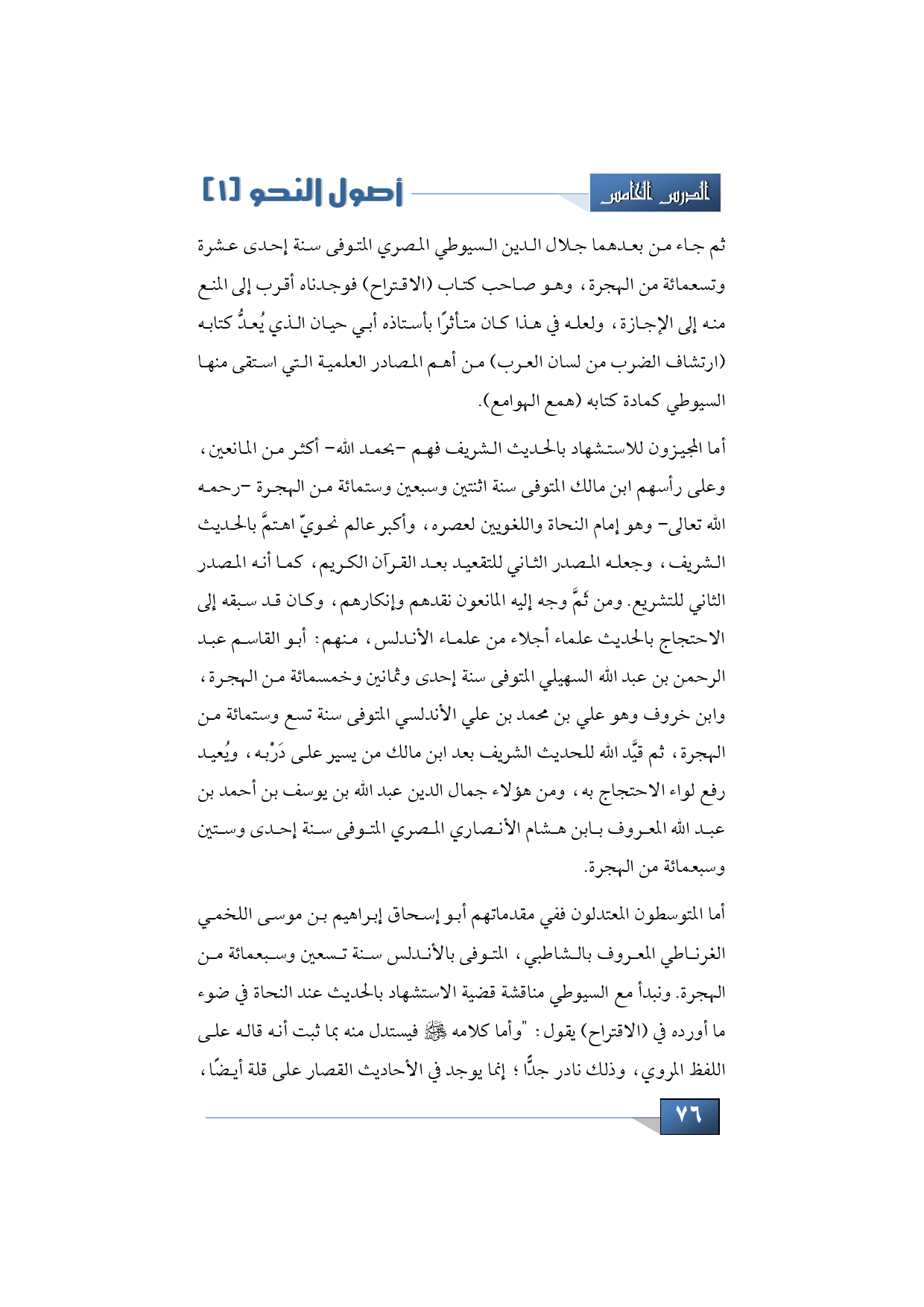 أما المتوسطون المعتدلون ففي مقدماتهم أبو إسحاق إبراهيم بن موسى اللخمي الغرناطي المعروف بالشاطبي، المتوفى بالأندلس سنة تسعين وسبعمائة من الهجرة. ونبدأ مع السيوطي مناقشة قضية الاستشهاد بالحديث عند النحاة في ضوء ما أورده في (الاقتراح) يقول: "وأما كلامه -صلى الله عليه وسلم- فيستدل منه بما ثبت أنه قاله على اللفظ المروي، وذلك نادر جدًّا؛ إنما يوجد في الأحاديث القصار على قلة أيضًا،