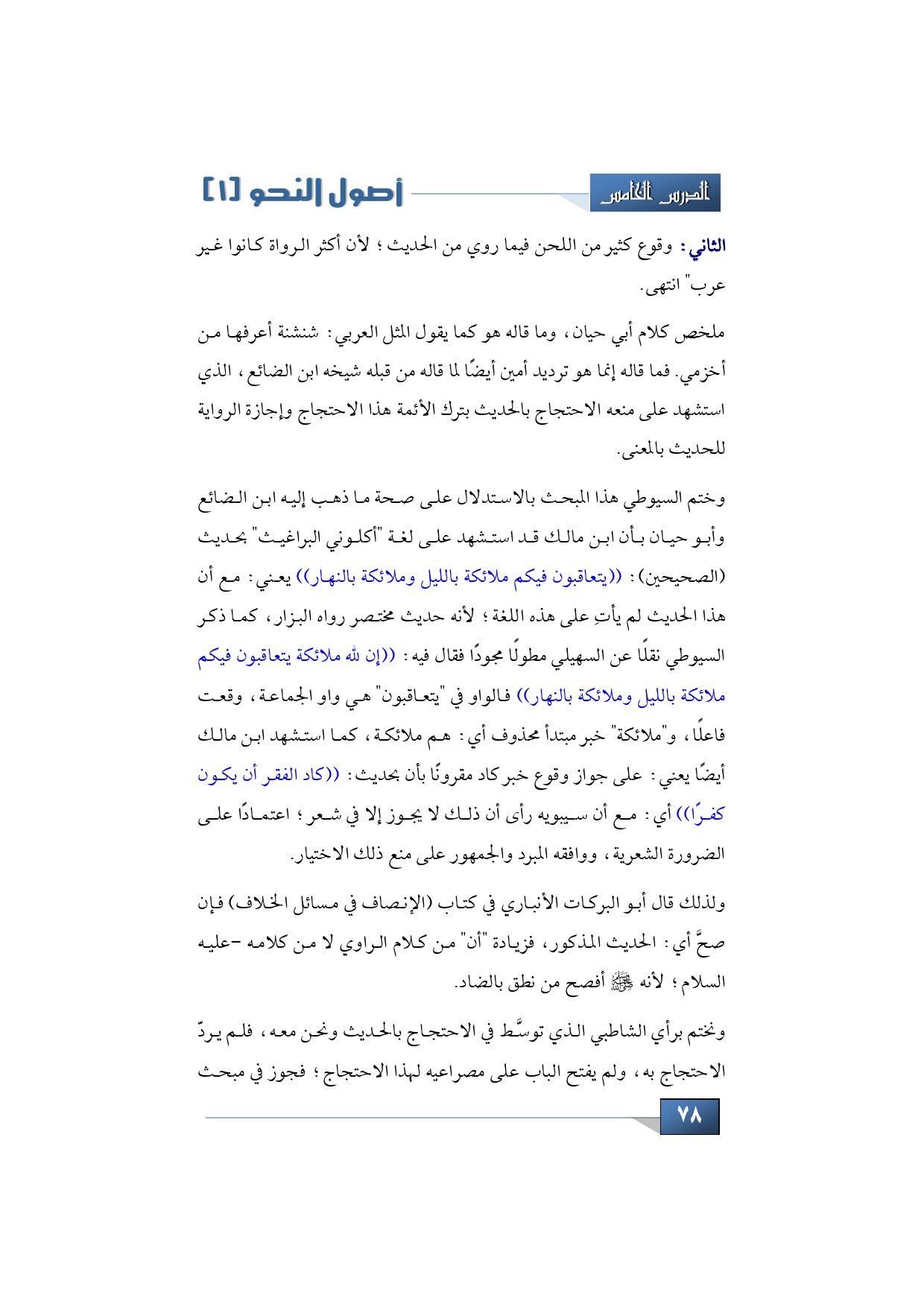 وختم السيوطي هذا المبحث بالاستدلال على صحة ما ذهب إليه ابن الضائع وأبو حيان بأن ابن مالك قد استشهد على لغة "أكلوني البراغيث" بحديث (الصحيحين): ((يتعاقبون فيكم ملائكة بالليل وملائكة بالنهار)) يعني: مع أن هذا الحديث لم يأتِ على هذه اللغة؛ لأنه حديث مختصر رواه البزار، كما ذكر السيوطي نقلًا عن السهيلي مطولًا مجودًا فقال فيه: ((إن لله ملائكة يتعاقبون فيكم ملائكة بالليل وملائكة بالنهار)) فالواو في "يتعاقبون" هي واو الجماعة، وقعت فاعلًا، و"ملائكة" خبر مبتدأ محذوف أي: هم ملائكة، كما استشهد ابن مالك أيضًا يعني: على جواز وقوع خبر كاد مقرونًا بأن بحديث: ((كاد الفقر أن يكون كفرًا)) أي: مع أن سيبويه رأى أن ذلك لا يجوز إلا في شعر؛ اعتمادًا على الضرورة الشعرية، ووافقه المبرد والجمهور على منع ذلك الاختيار.