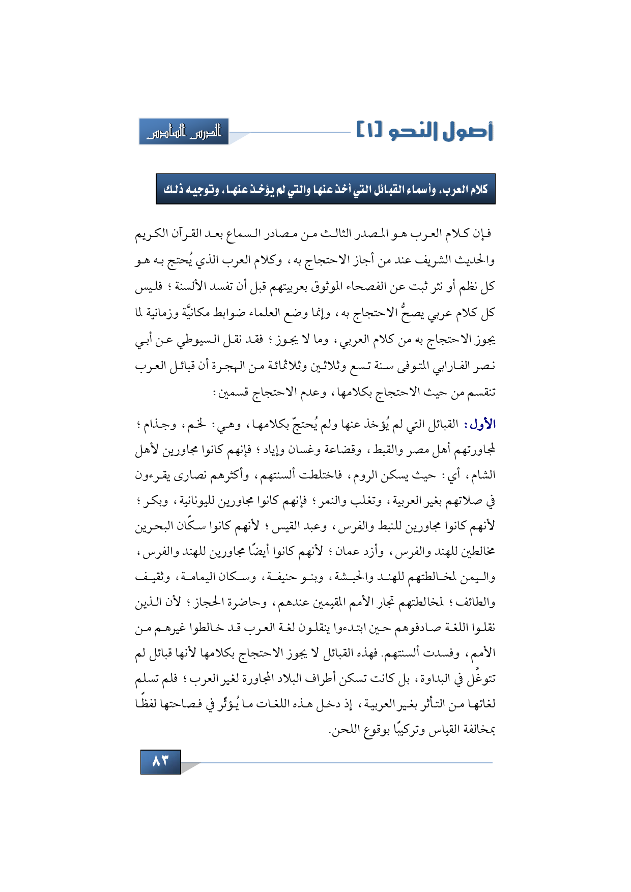 كلام العرب، وأسماء القبائل التي أخذ عنها والتي لم يؤخذ عنها، وتوجيه ذلك