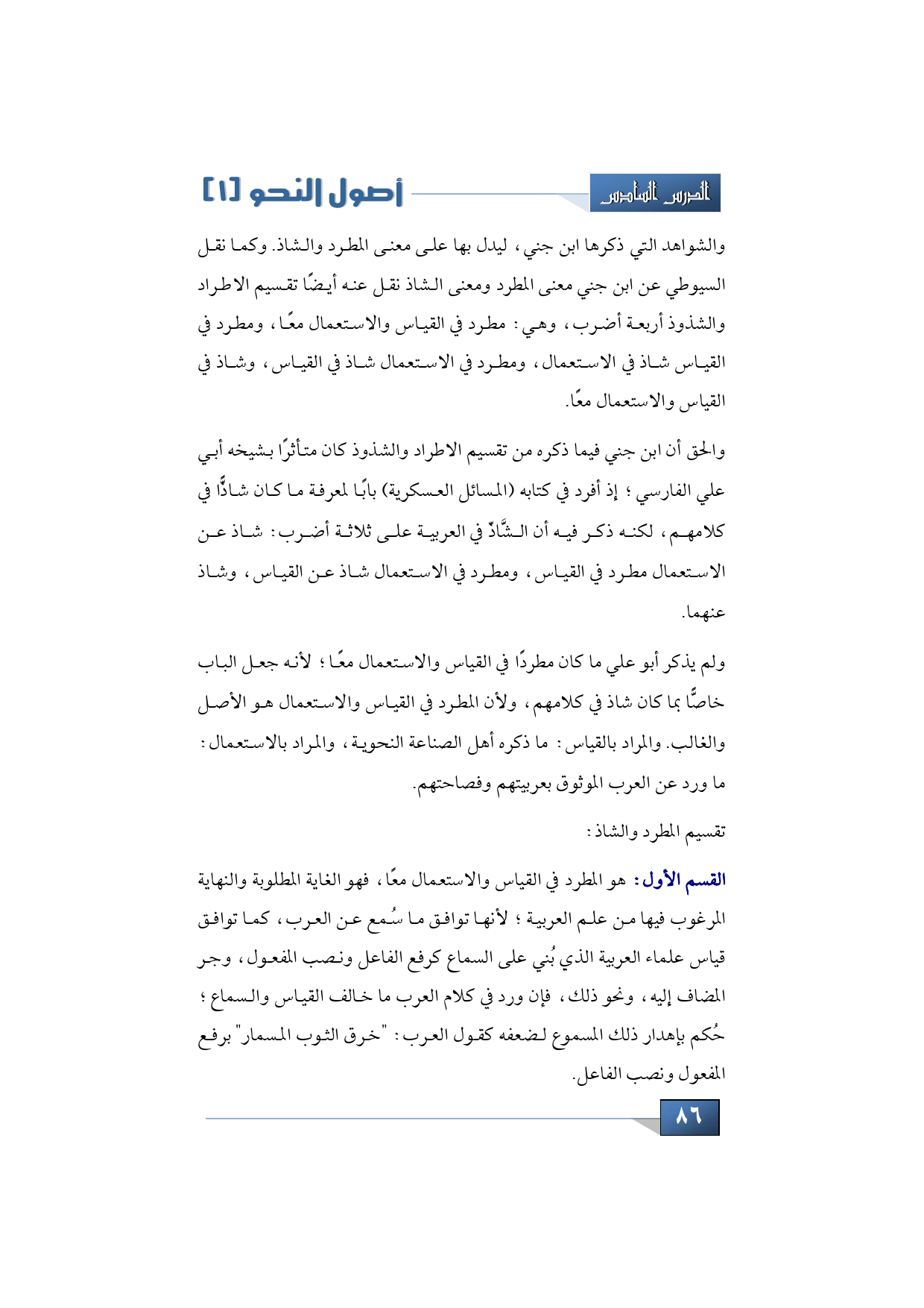 تقسيم المطرد والشاذ: أما القسم الأول منه وهو المطرد في القياس والاستعمال معًا، فهو الغاية المطلوبة والنهاية المرغوب فيها من علم العربية؛ لأنها توافق ما سُمع عن العرب، كما توافق قياس علماء العربية الذي بُني على السماع كرفع الفاعل ونصب المفعول، وجر المضاف إليه، ونحو ذلك، فإن ورد في كلام العرب ما خالف القياس والسماع؛ حُكم بإهدار ذلك المسموع لضعفه كقول العرب: "خرق الثوب المسمار" برفع المفعول ونصب الفاعل.