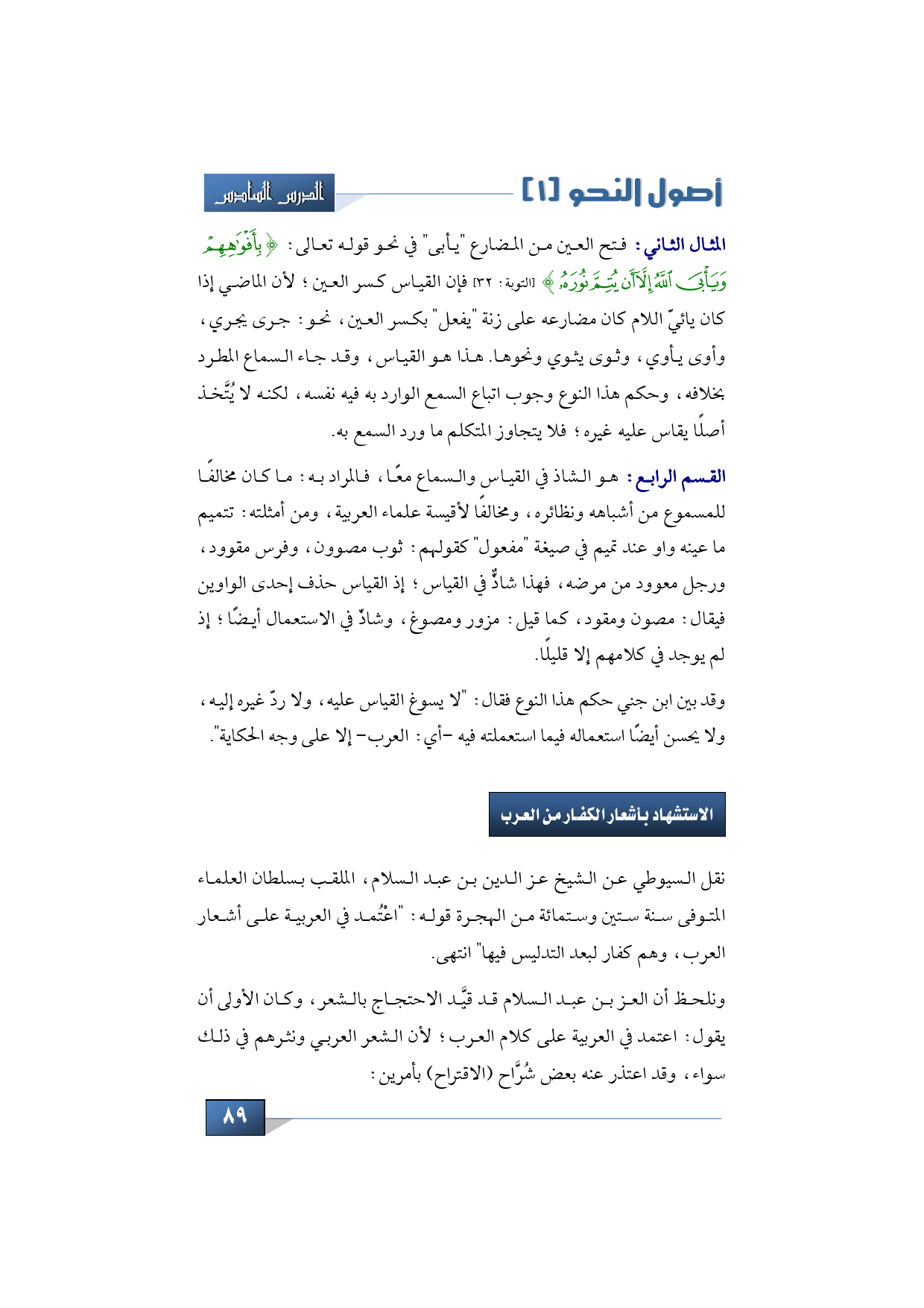 نقل السيوطي عن الشيخ عز الدين بن عبد السلام، الملقب بسلطان العلماء المتوفى سنة ستين وستمائة من الهجرة قوله: "اعْتُمد في العربية على أشعار العرب، وهم كفار لبعد التدليس فيها" انتهى.