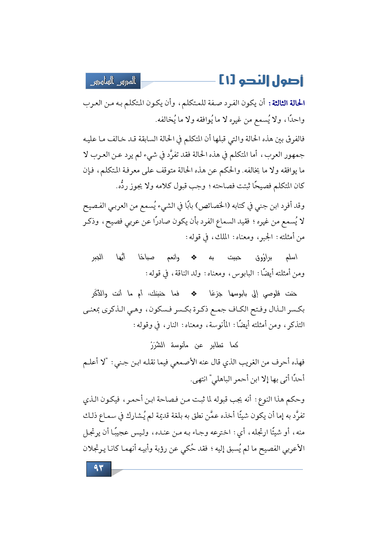 والحالة الثالثة: أن يكون الفرد صفة للمتكلم، وأن يكون المتكلم به من العرب واحدًا، ولا يُسمع من غيره لا ما يُوافقه ولا ما يُخالفه.