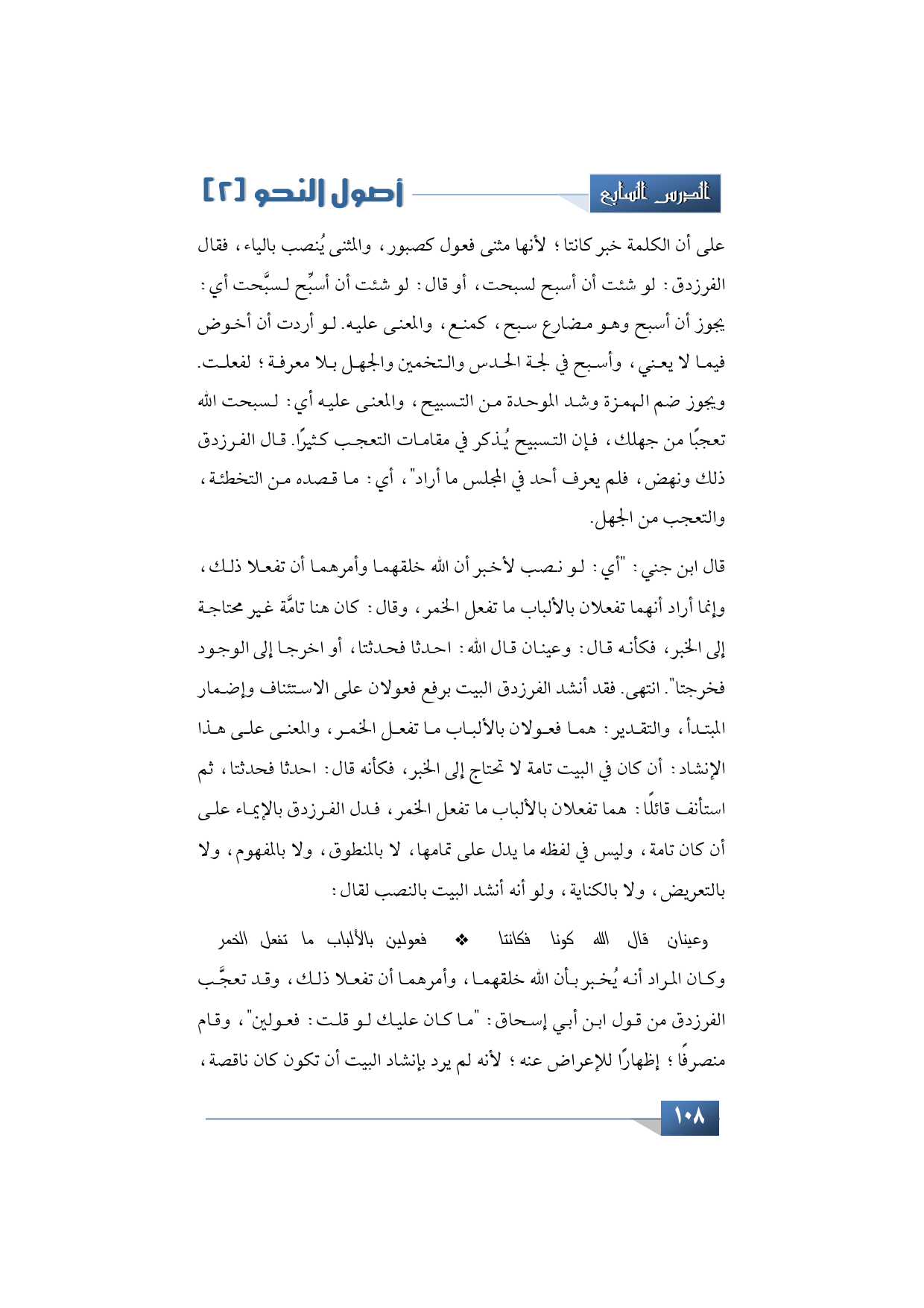 على أن الكلمة خبر كانتا؛ لأنها مثنى فعول كصبور، والمثنى يُنصب بالياء، فقال الفرزدق: لو شئت أن أسبح لسبحت، أو قال: لو شئت أن أسبِّح لسبَّحت أي: يجوز أن أسبح وهو مضارع سبح، كمنع، والمعنى عليه. لو أردت أن أخوض فيما لا يعني، وأسبح في لجة الحدس والتخمين والجهل بلا معرفة؛ لفعلت. ويجوز ضم الهمزة وشد الموحدة من التسبيح، والمعنى عليه أي: لسبحت الله تعجبًا من جهلك، فإن التسبيح يُذكر في مقامات التعجب كثيرًا. قال الفرزدق ذلك ونهض، فلم يعرف أحد في المجلس ما أراد"، أي: ما قصده من التخطئة، والتعجب من الجهل.