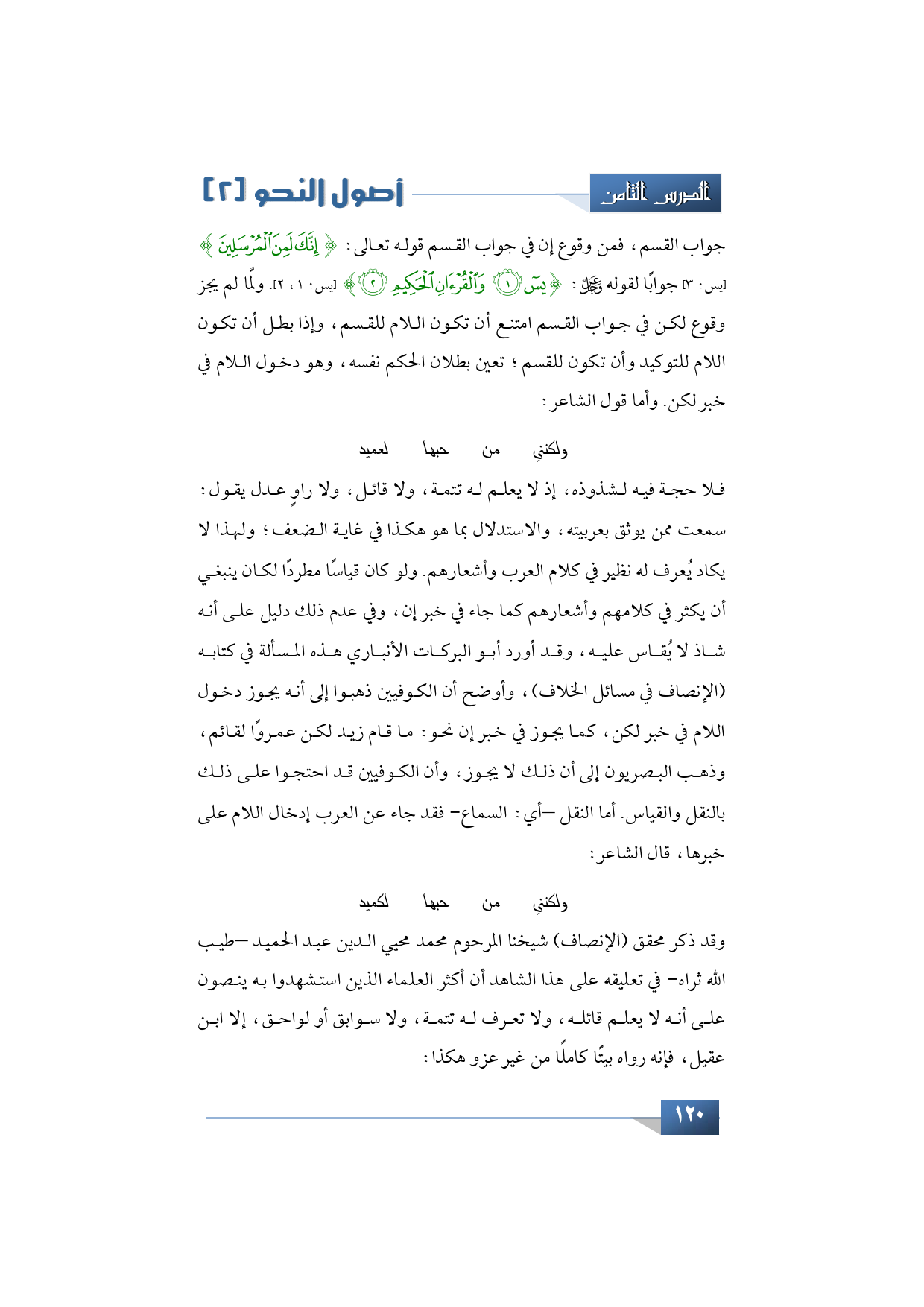 جواب القسم، فمن وقوع إن في جواب القسم قوله تعالى: {إِنَّكَ لَمِنَ الْمُرْسَلِينَ} (يس: 3) جوابًا لقوله عز وجل: {يس * وَالْقُرْآنِ الْحَكِيمِ} (يس: 1، 2). ولمَّا لم يجز وقوع لكن في جواب القسم امتنع أن تكون اللام للقسم، وإذا بطل أن تكون اللام للتوكيد وأن تكون للقسم؛ تعين بطلان الحكم نفسه، وهو دخول اللام في خبر لكن. وأما قول الشاعر: