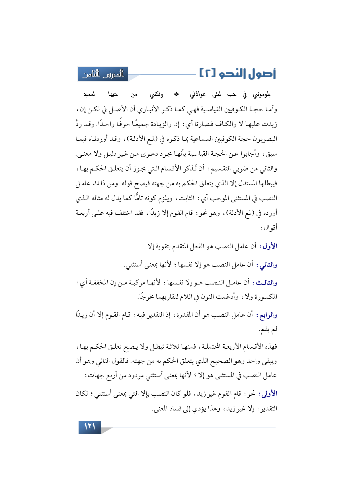 فهذه الأقسام الأربعة المحتملة، فمنها ثلاثة تبطل ولا يصح تعلق الحكم بها، ويبقى واحد وهو الصحيح الذي يتعلق الحكم به من جهته. فالقول الثاني وهو أن عامل النصب في المستثنى هو إلا؛ لأنها بمعنى أستثني مردود من أربع جهات؛ الأولى: نحو: قام القوم غير زيد، فلو كان النصب بإلا التي بمعنى أستثني؛ لكان التقدير: إلا غير زيد، وهذا يؤدي إلى فساد المعنى.