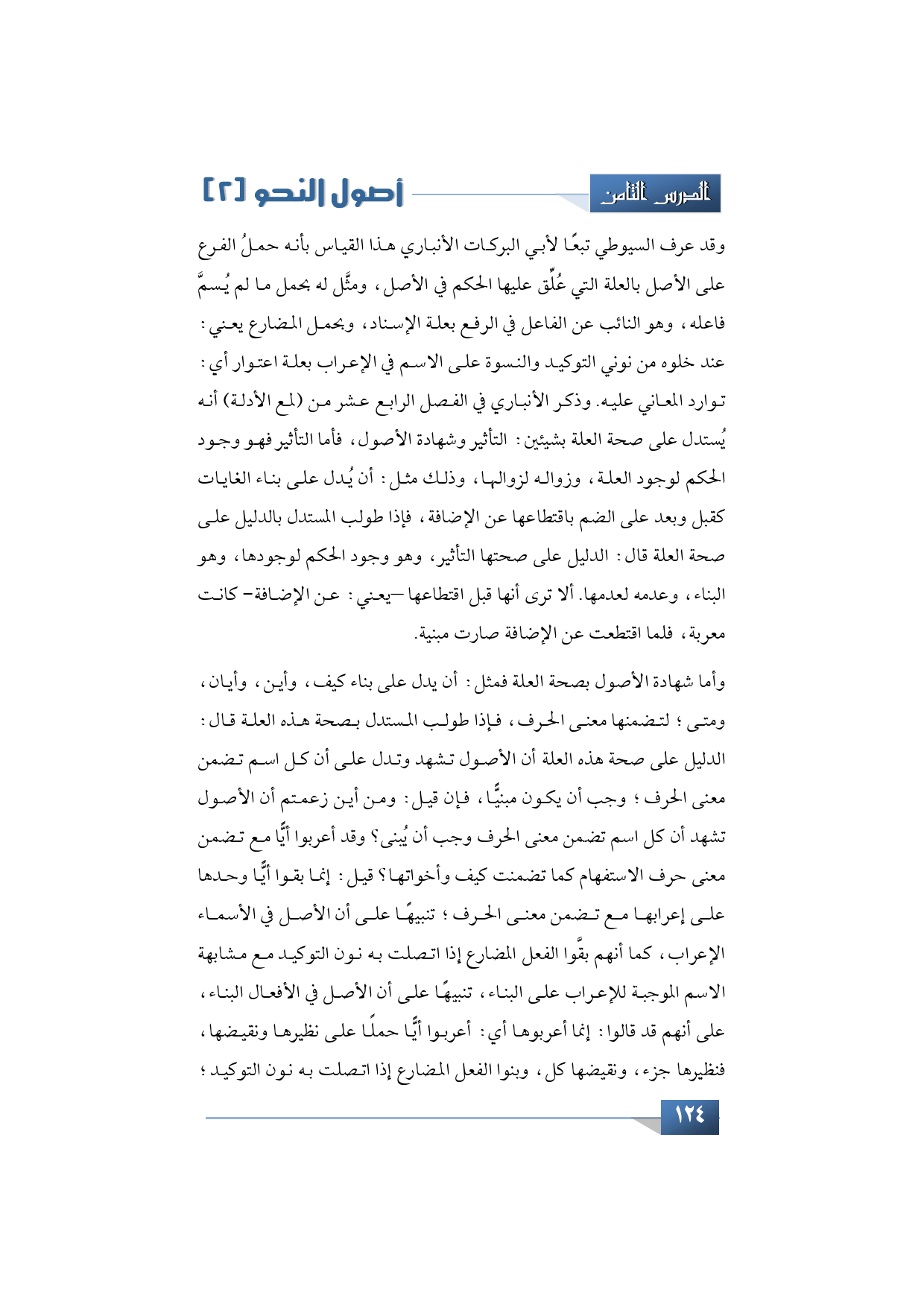 وقد عرف السيوطي تبعًا لأبي البركات الأنباري هذا القياس بأنه حملُ الفرع على الأصل بالعلة التي عُلِّق عليها الحكم في الأصل، ومثَّل له بحمل ما لم يُسمَّ فاعله، وهو النائب عن الفاعل في الرفع بعلة الإسناد، وبحمل المضارع يعني: عند خلوه من نوني التوكيد والنسوة على الاسم في الإعراب بعلة اعتوار أي: توارد المعاني عليه. وذكر الأنباري في الفصل الرابع عشر من (لمع الأدلة) أنه يُستدل على صحة العلة بشيئين: التأثير وشهادة الأصول، فأما التأثير فهو وجود الحكم لوجود العلة، وزواله لزوالها، وذلك مثل: أن يُدل على بناء الغايات كقبل وبعد على الضم باقتطاعها عن الإضافة، فإذا طولب المستدل بالدليل على صحة العلة قال: الدليل على صحتها التأثير، وهو وجود الحكم لوجودها، وهو البناء، وعدمه لعدمها. ألا ترى أنها قبل اقتطاعها -يعني: عن الإضافة- كانت معربة، فلما اقتطعت عن الإضافة صارت مبنية.
