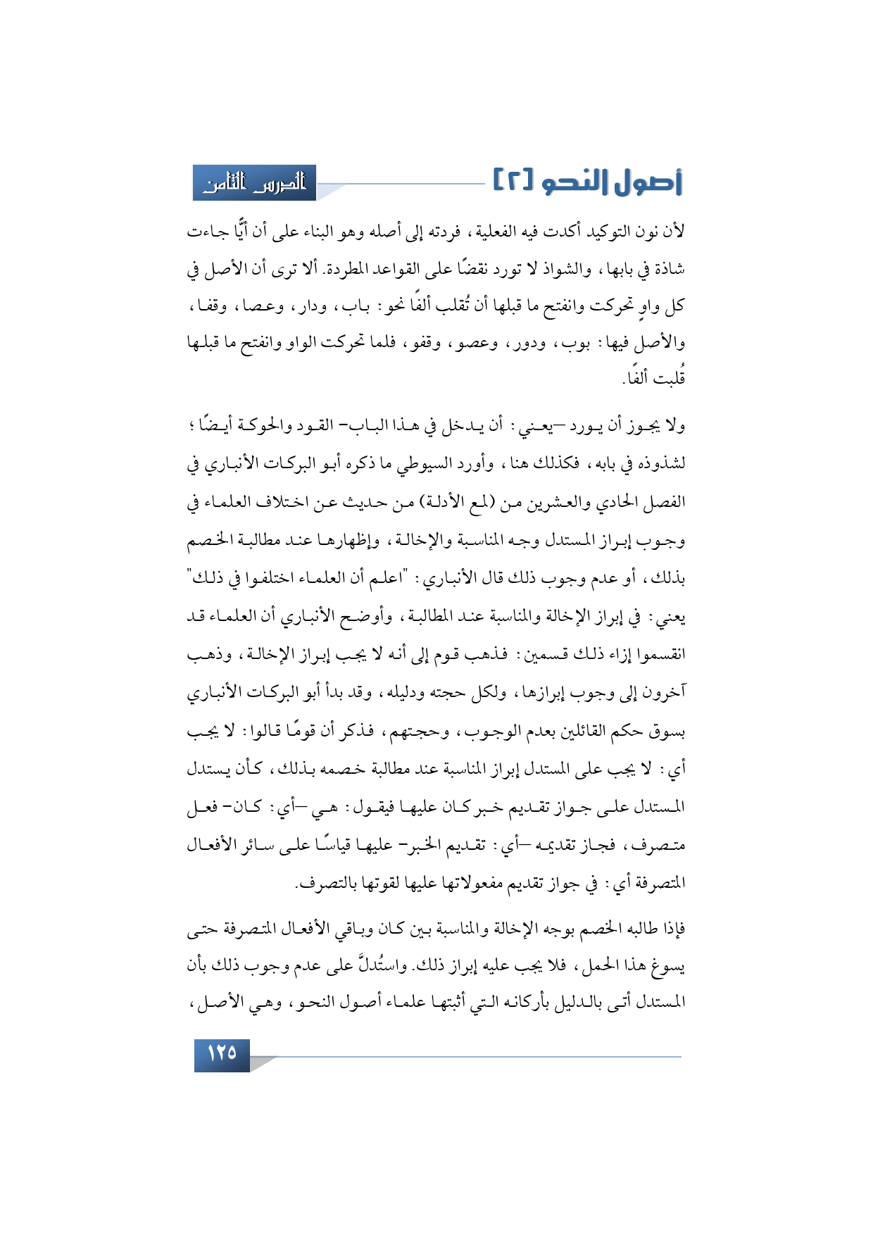 ولا يجوز أن يورد -يعني: أن يدخل في هذا الباب- القود والحوكة أيضًا؛ لشذوذه في بابه، فكذلك هنا، وأورد السيوطي ما ذكره أبو البركات الأنباري في الفصل الحادي والعشرين من (لمع الأدلة) من حديث عن اختلاف العلماء في وجوب إبراز المستدل وجه المناسبة والإخالة، وإظهارها عند مطالبة الخصم بذلك، أو عدم وجوب ذلك قال الأنباري: "اعلم أن العلماء اختلفوا في ذلك" يعني: في إبراز الإخالة والمناسبة عند المطالبة، وأوضح الأنباري أن العلماء قد انقسموا إزاء ذلك قسمين: فذهب قوم إلى أنه لا يجب إبراز الإخالة، وذهب آخرون إلى وجوب إبرازها، ولكل حجته ودليله، وقد بدأ أبو البركات الأنباري بسوق حكم القائلين بعدم الوجوب، وحجتهم، فذكر أن قومًا قالوا: لا يجب أي: لا يجب على المستدل إبراز المناسبة عند مطالبة خصمه بذلك، كأن يستدل المستدل على جواز تقديم خبر كان عليها فيقول: هي -أي: كان- فعل متصرف، فجاز تقديمه -أي: تقديم الخبر- عليها قياسًا على سائر الأفعال المتصرفة أي: في جواز تقديم مفعولاتها عليها لقوتها بالتصرف.