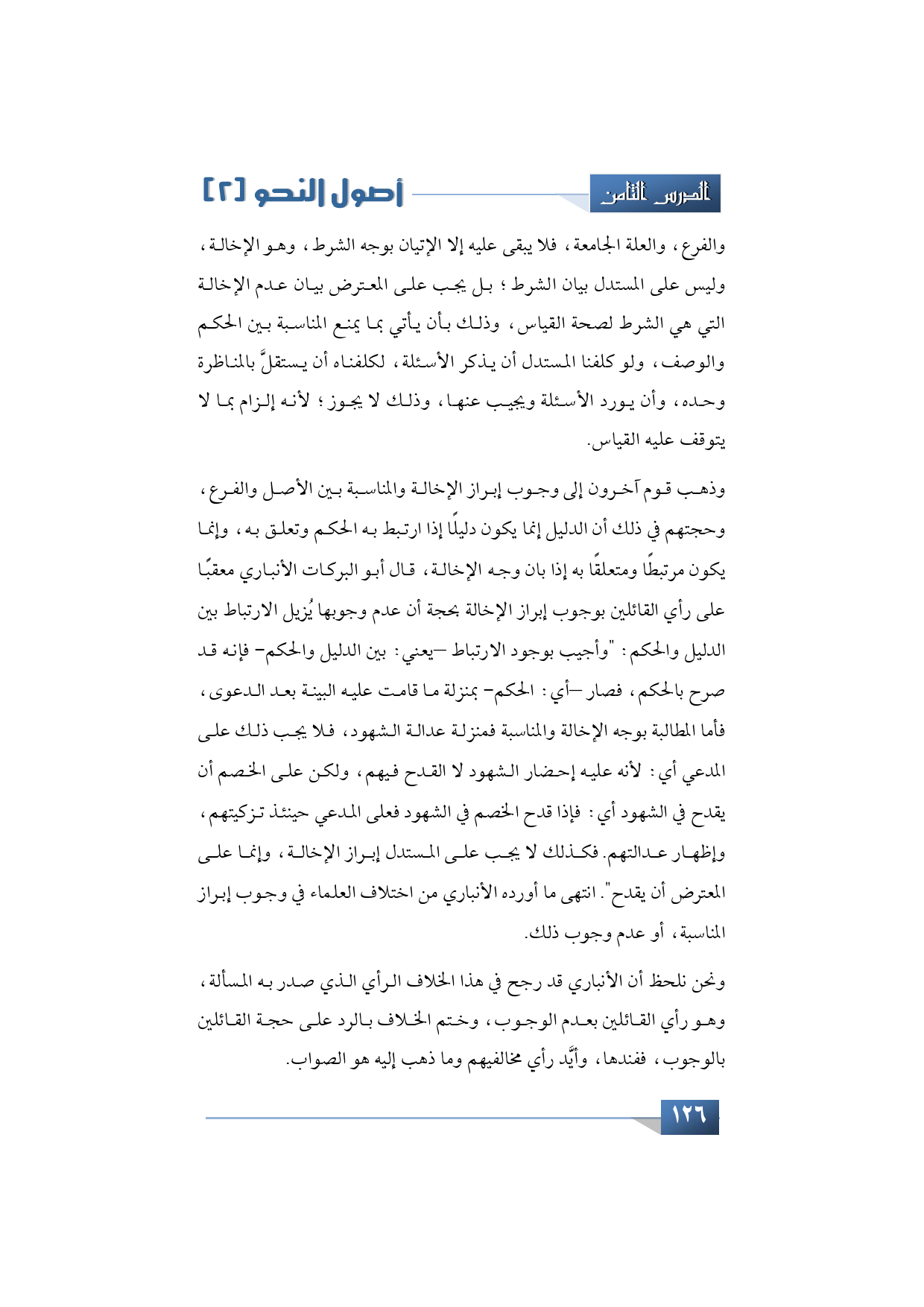 وذهب قوم آخرون إلى وجوب إبراز الإخالة والمناسبة بين الأصل والفرع، وحجتهم في ذلك أن الدليل إنما يكون دليلًا إذا ارتبط به الحكم وتعلق به، وإنما يكون مرتبطًا ومتعلقًا به إذا بان وجه الإخالة، قال أبو البركات الأنباري معقبًا على رأي القائلين بوجوب إبراز الإخالة بحجة أن عدم وجوبها يُزيل الارتباط بين الدليل والحكم: "وأجيب بوجود الارتباط -يعني: بين الدليل والحكم- فإنه قد صرح بالحكم، فصار -أي: الحكم- بمنزلة ما قامت عليه البينة بعد الدعوى، فأما المطالبة بوجه الإخالة والمناسبة فمنزلة عدالة الشهود، فلا يجب ذلك على المدعي أي: لأنه عليه إحضار الشهود لا القدح فيهم، ولكن على الخصم أن يقدح في الشهود أي: فإذا قدح الخصم في الشهود فعلى المدعي حينئذ تزكيتهم، وإظهار عدالتهم. فكذلك لا يجب على المستدل إبراز الإخالة، وإنما على المعترض أن يقدح". انتهى ما أورده الأنباري من اختلاف العلماء في وجوب إبراز المناسبة، أو عدم وجوب ذلك.