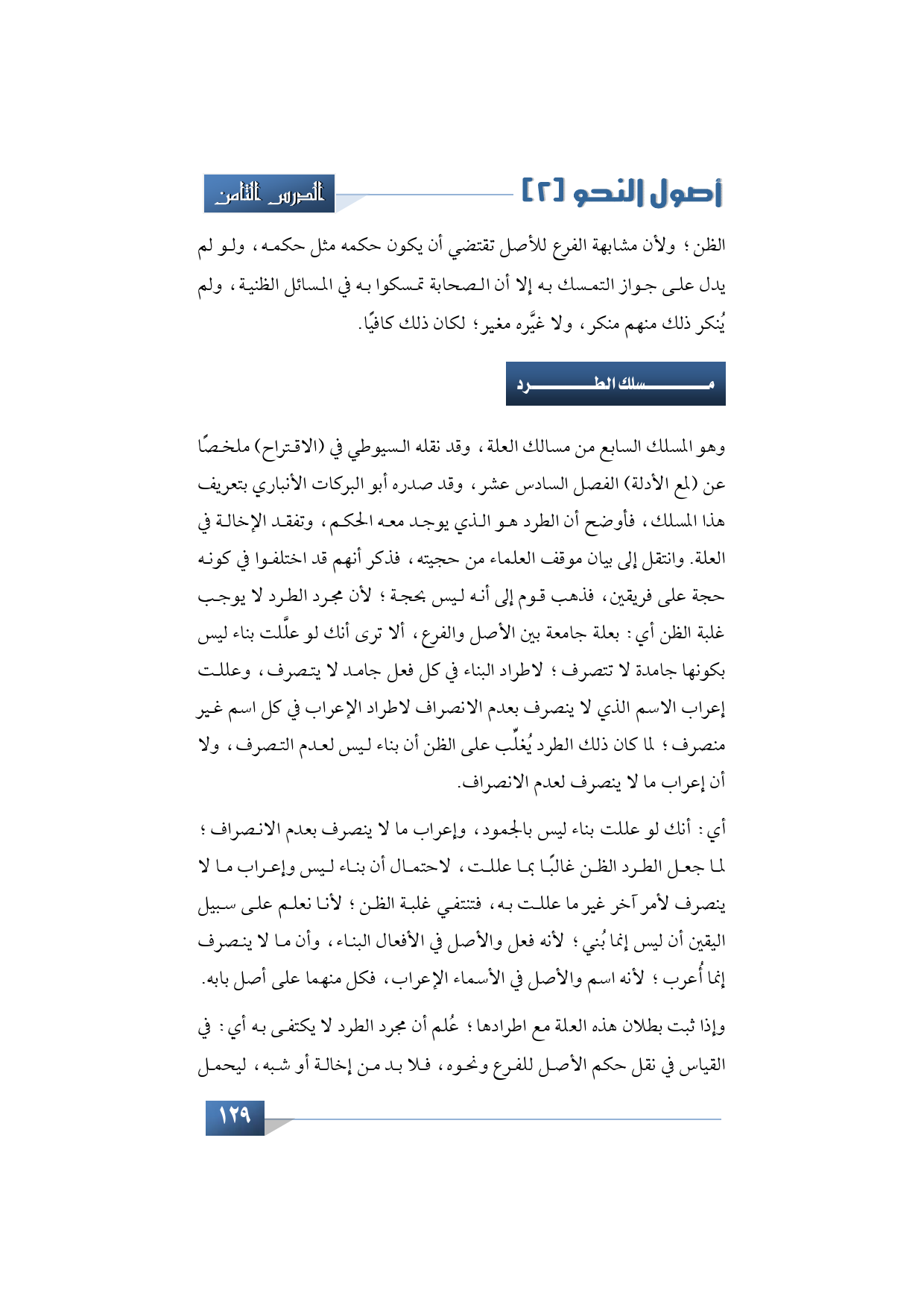 وهو المسلك السابع من مسالك العلة، وقد نقله السيوطي في (الاقتراح) ملخصًا عن (لمع الأدلة) الفصل السادس عشر، وقد صدره أبو البركات الأنباري بتعريف هذا المسلك، فأوضح أن الطرد هو الذي يوجد معه الحكم، وتفقد الإخالة في العلة. وانتقل إلى بيان موقف العلماء من حجيته، فذكر أنهم قد اختلفوا في كونه حجة على فريقين، فذهب قوم إلى أنه ليس بحجة؛ لأن مجرد الطرد لا يوجب غلبة الظن أي: بعلة جامعة بين الأصل والفرع، ألا ترى أنك لو علَّلت بناء ليس بكونها جامدة لا تتصرف؛ لاطراد البناء في كل فعل جامد لا يتصرف، وعللت إعراب الاسم الذي لا ينصرف بعدم الانصراف لاطراد الإعراب في كل اسم غير منصرف؛ لما كان ذلك الطرد يُغلِّب على الظن أن بناء ليس لعدم التصرف، ولا أن إعراب ما لا ينصرف لعدم الانصراف.