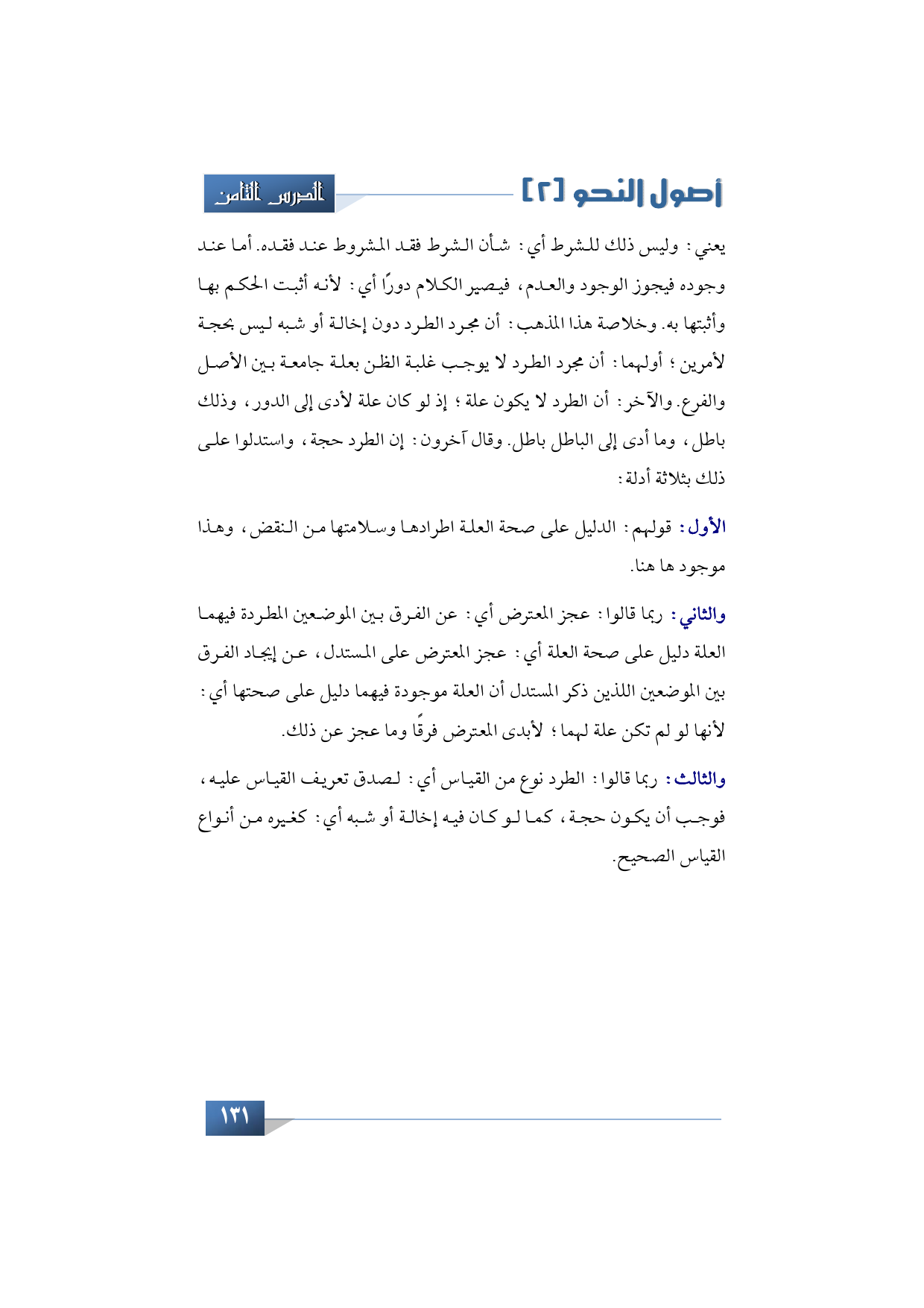 يعني: وليس ذلك للشرط أي: شأن الشرط فقد المشروط عند فقده. أما عند وجوده فيجوز الوجود والعدم، فيصير الكلام دورًا أي: لأنه أثبت الحكم بها وأثبتها به. وخلاصة هذا المذهب: أن مجرد الطرد دون إخالة أو شبه ليس بحجة لأمرين؛ أولهما: أن مجرد الطرد لا يوجب غلبة الظن بعلة جامعة بين الأصل والفرع. والآخر: أن الطرد لا يكون علة؛ إذ لو كان علة لأدى إلى الدور، وذلك باطل، وما أدى إلى الباطل باطل. وقال آخرون: إن الطرد حجة، واستدلوا على ذلك بثلاثة أدلة: