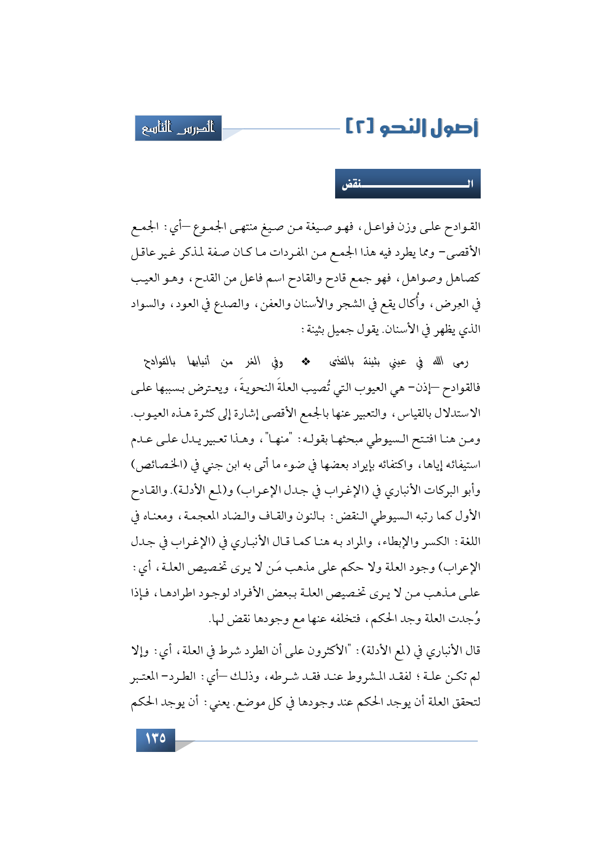فالقوادح -إذن- هي العيوب التي تُصيب العلةَ النحويةَ، ويعترض بسببها على الاستدلال بالقياس، والتعبير عنها بالجمع الأقصى إشارة إلى كثرة هذه العيوب. ومن هنا افتتح السيوطي مبحثها بقوله: "منها"، وهذا تعبير يدل على عدم استيفائه إياها، واكتفائه بإيراد بعضها في ضوء ما أتى به ابن جني في (الخصائص) وأبو البركات الأنباري في (الإغراب في جدل الإعراب) و (لمع الأدلة). والقادح الأول كما رتبه السيوطي النقض: بالنون والقاف والضاد المعجمة، ومعناه في اللغة: الكسر والإبطاء، والمراد به هنا كما قال الأنباري في (الإغراب في جدل الإعراب) وجود العلة ولا حكم على مذهب مَن لا يرى تخصيص العلة، أي: على مذهب من لا يرى تخصيص العلة ببعض الأفراد لوجود اطرادها، فإذا وُجدت العلة وجد الحكم، فتخلفه عنها مع وجودها نقض لها.
