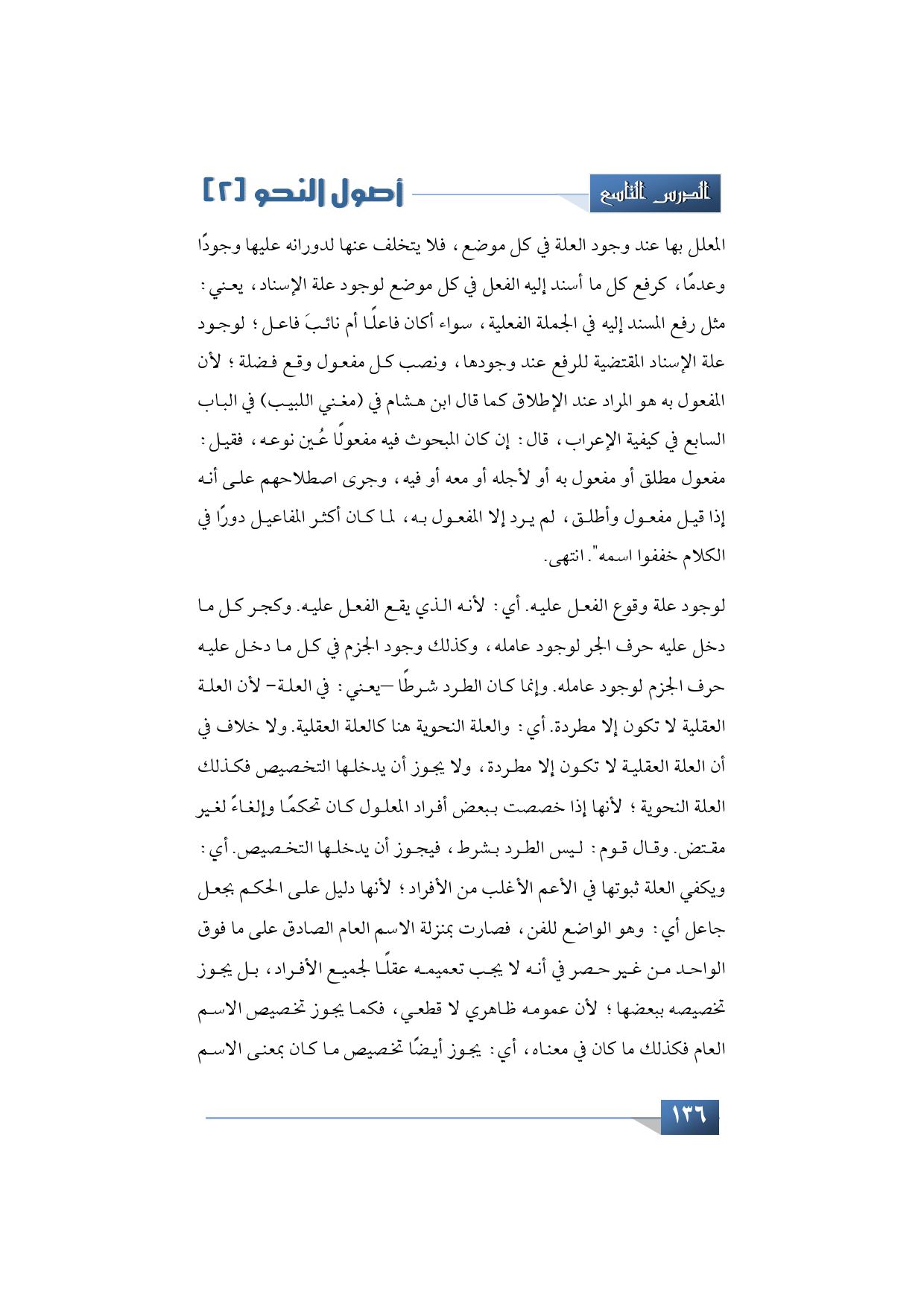 المعلل بها عند وجود العلة في كل موضع، فلا يتخلف عنها لدورانه عليها وجودًا وعدمًا، كرفع كل ما أسند إليه الفعل في كل موضع لوجود علة الإسناد، يعني: مثل رفع المسند إليه في الجملة الفعلية، سواء أكان فاعلًا أم نائبَ فاعل. لوجود علة الإسناد المقتضية للرفع عند وجودها، ونصب كل مفعول وقع فضلة؛ لأن المفعول به هو المراد عند الإطلاق كما قال ابن هشام في (مغني اللبيب) في الباب السابع في كيفية الإعراب، قال: إن كان المبحوث فيه مفعولًا عُين نوعه، فقيل: مفعول مطلق أو مفعول به أو لأجله أو معه أو فيه، وجرى اصطلاحهم على أنه إذا قيل مفعول وأطلق، لم يرد إلا المفعول به، لما كان أكثر المفاعيل دورًا في الكلام خففوا اسمه". انتهى.