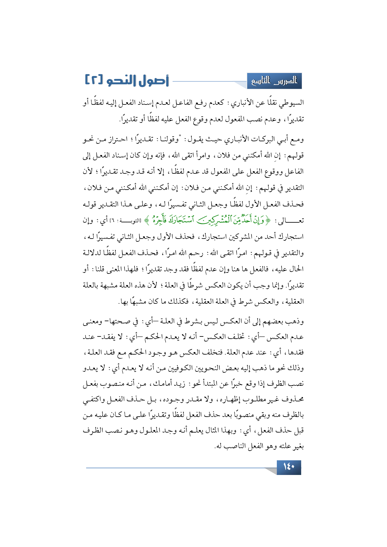 ومع أبي البركات الأنباري حيث يقول: "وقولنا: تقديرًا؛ احتراز من نحو قولهم: إنِ الله أمكنني من فلان، وامرأ اتقى الله، فإنه وإن كان إسناد الفعل إلى الفاعل ووقوع الفعل على المفعول قد عدم لفظًا، إلا أنه قد وجد تقديرًا؛ لأن التقدير في قولهم: إنِ الله أمكنني من فلان: إن أمكنني الله أمكنني من فلان، فحذف الفعل الأول لفظًا وجعل الثاني تفسيرًا له، وعلى هذا التقدير قوله تعالى: {وَإِنْ أَحَدٌ مِنَ الْمُشْرِكِينَ اسْتَجَارَكَ فَأَجِرْهُ} (التوبة: 6) أي: وإن استجارك أحد من المشركين استجارك، فحذف الأول وجعل الثاني تفسيرًا له، والتقدير في قولهم: امرأً اتقى الله: رحم الله امرأً، فحذف الفعل لفظًا لدلالة الحال عليه، فالفعل ها هنا وإن عدم لفظًا فقد وجد تقديرًا، فلهذا المعنى قلنا: أو تقديرًا. وإنما وجب أن يكون العكس شرطًا في العلة؛ لأن هذه العلة مشبهة بالعلة العقلية، والعكس شرط في العلة العقلية، فكذلك ما كان مشبهًا بها.