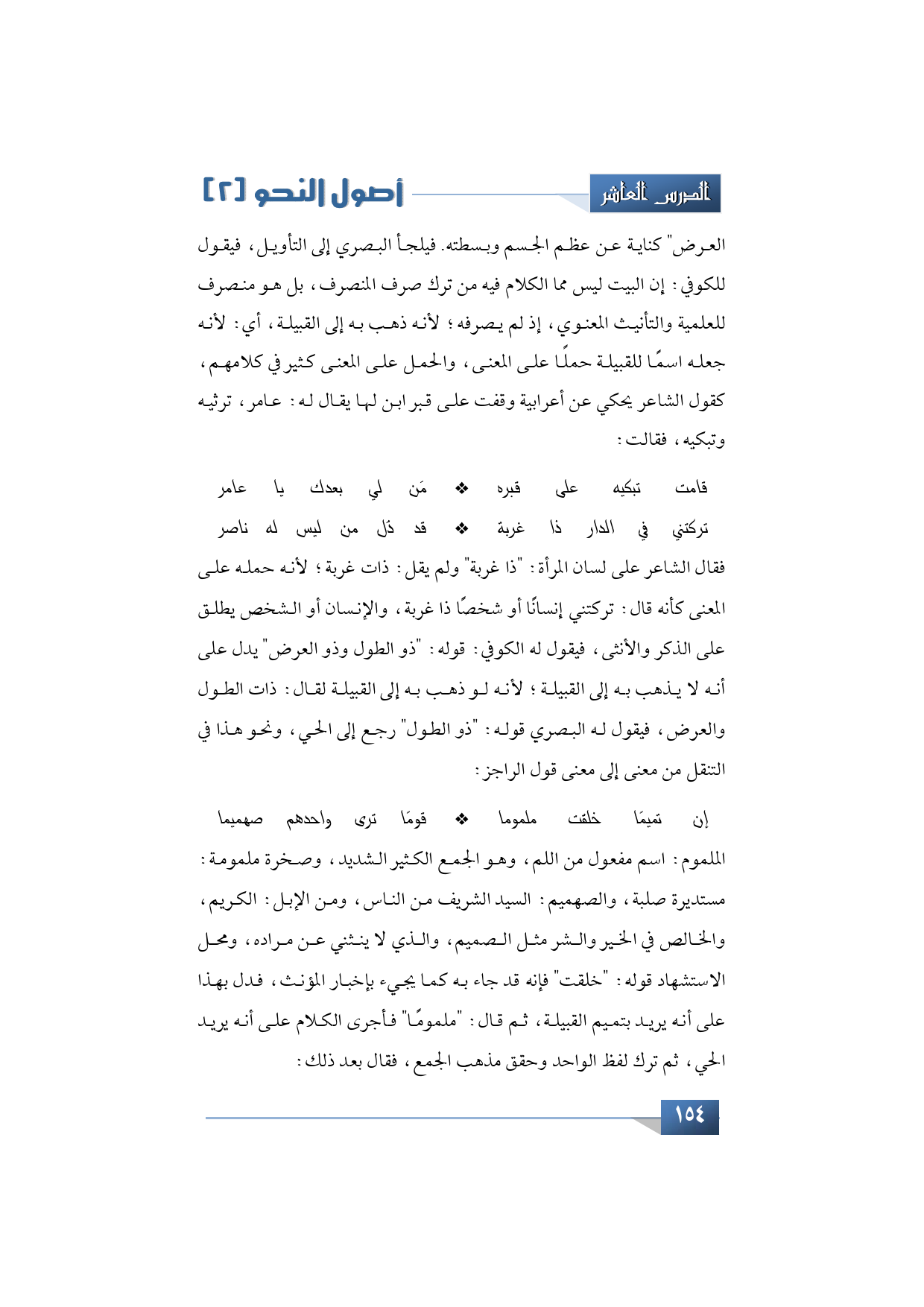 العرض" كناية عن عظم الجسم وبسطته. فيلجأ البصري إلى التأويل، فيقول للكوفي: إن البيت ليس مما الكلام فيه من ترك صرف المنصرف، بل هو منصرف للعلمية والتأنيث المعنوي، إذ لم يصرفه؛ لأنه ذهب به إلى القبيلة، أي: لأنه جعله اسمًا للقبيلة حملًا على المعنى، والحمل على المعنى كثير في كلامهم، كقول الشاعر يحكي عن أعرابية وقفت على قبر ابن لها يقال له: عامر، ترثيه وتبكيه، فقالت: