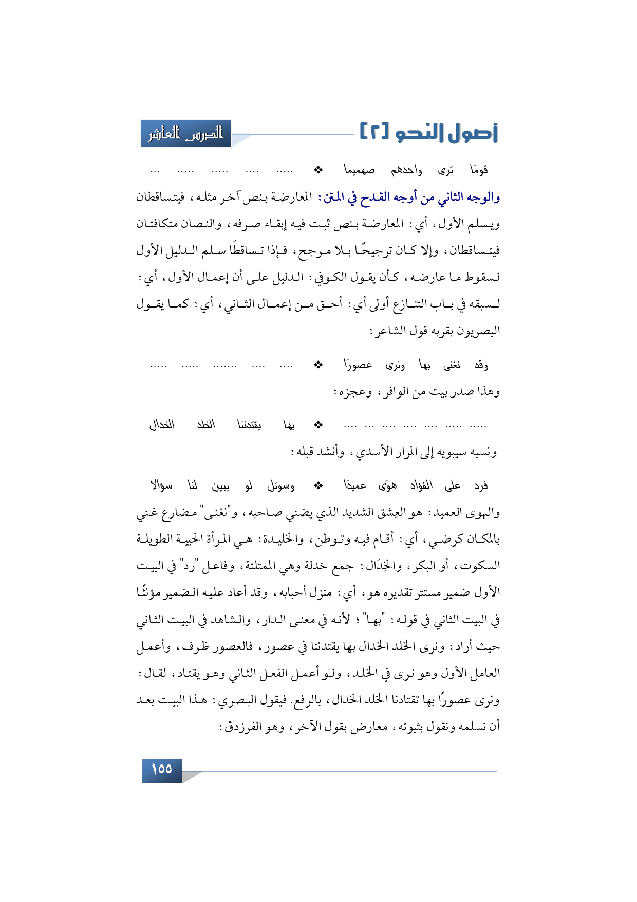 والهوى العميد: هو العِشق الشديد الذي يضني صاحبه، و"نغنى" مضارع غني بالمكان كرضي، أي: أقام فيه وتوطن، والخليدة: هي المرأة الحيية الطويلة السكوت، أو البكر، والخِدَال: جمع خدلة وهي الممتلئة، وفاعل "رد" في البيت الأول ضمير مستتر تقديره هو، أي: منزل أحبابه، وقد أعاد عليه الضمير مؤنثًا في البيت الثاني في قوله: "بها"؛ لأنه في معنى الدار، والشاهد في البيت الثاني حيث أراد: ونرى الخلد الخدال بها يقتدننا في عصور، فالعصور ظرف، وأعمل العامل الأول وهو نرى في الخلد، ولو أعمل الفعل الثاني وهو يقتاد، لقال: ونرى عصورًا بها تقتادنا الخلد الخدال، بالرفع. فيقول البصري: هذا البيت بعد أن نسلمه ونقول بثبوته، معارض بقول الآخر، وهو الفرزدق: