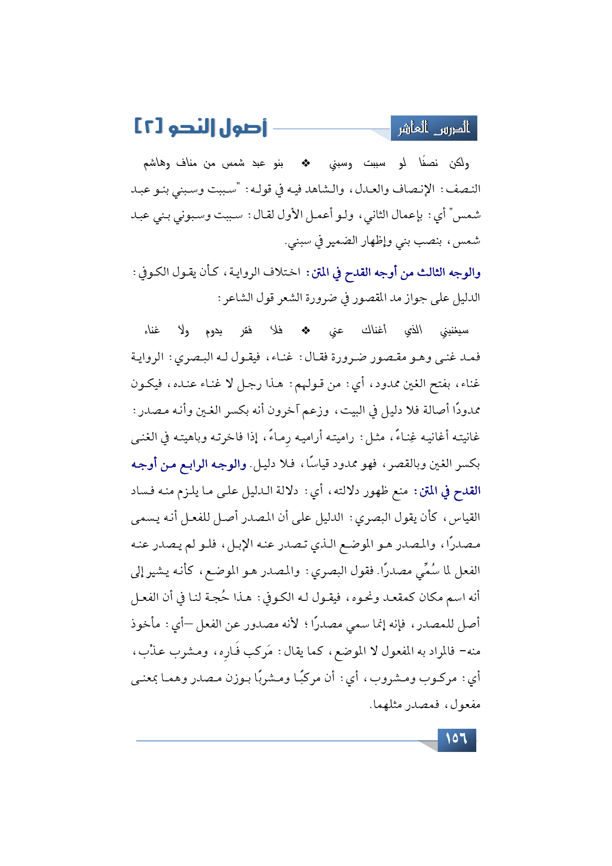 النصف: الإنصاف والعدل، والشاهد فيه في قوله: "سببت وسبني بنو عبد شمس" أي: بإعمال الثاني، ولو أعمل الأول لقال: سببت وسبوني بني عبد شمس، بنصب بني وإظهار الضمير في سبني. والوجه الثالث من أوجه القدح في المتن: اختلاف الرواية، كأن يقول الكوفي: الدليل على جواز مد المقصور في ضرورة الشعر قول الشاعر:
