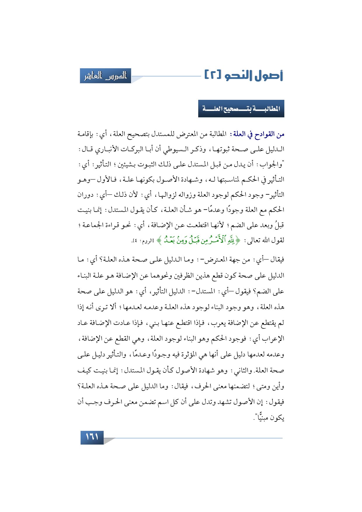 من القوادح في العلة: المطالبة من المعترض للمستدل بتصحيح العلة، أي: بإقامة الدليل على صحة ثبوتها، وذكر السيوطي أن أبا البركات الأنباري قال: "والجواب: أن يدل من قبل المستدل على ذلك الثبوت بشيئين؛ التأثير: أي: التأثير في الحكم لمناسبتها له، وشهادة الأصول بكونها علة، فالأول -وهو التأثير- وجود الحكم لوجود العلة وزواله لزوالها، أي: لأن ذلك -أي: دوران الحكم مع العلة وجودًا وعدمًا- هو شأن العلة، كأن يقول المستدل: إنما بنيت قبلُ وبعد على الضم؛ لأنها اقتطعت عن الإضافة، أي: نحو قراءة الجماعة؛ لقول الله تعالى: {لِلَّهِ الْأَمْرُ مِنْ قَبْلُ وَمِنْ بَعْدُ} (الروم: 4).