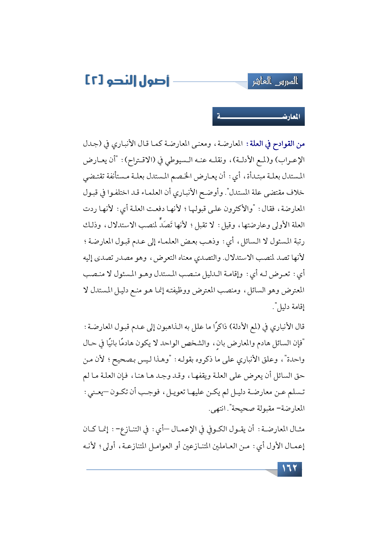 من القوادح في العلة: المعارضة، ومعنى المعارضة كما قال الأنباري في (جدل الإعراب) و (لمع الأدلة) ونقله عنه السيوطي في (الاقتراح): "أن يعارض المستدل بعلة مبتدأة، أي: أن يعارض الخصم المستدل بعلة مستأنفة تقتضي خلاف مقتضى علة المستدل". وأوضح الأنباري أن العلماء قد اختلفوا في قبول المعارضة، فقال: "والأكثرون على قبولها؛ لأنها دفعت العلة أي: لأنها ردت العلة الأولى وعارضتها، وقيل: لا تقبل؛ لأنها تَصَدٍّ لمنصب الاستدلال، وذلك رتبة المسئول لا السائل، أي: وذهب بعض العلماء إلى عدم قبول المعارضة؛ لأنها تصد لمنصب الاستدلال. والتصدي معناه التعرض، وهو مصدر تصدى إليه أي: تعرض له أي: وإقامة الدليل منصب المستدل وهو المسئول لا منصب المعترض وهو السائل، ومنصب المعترض ووظيفته إنما هو منع دليل المستدل لا إقامة دليل".