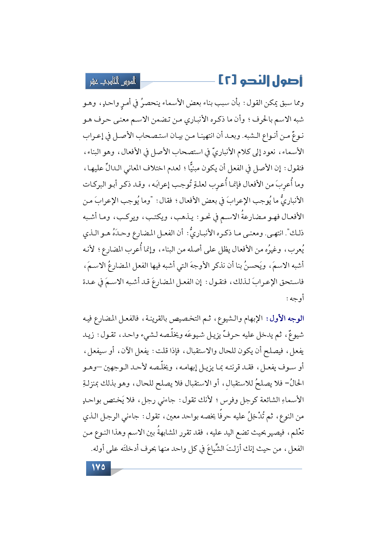 الوجه الأول: الإبهام والشيوع، ثم التخصيص بالقرينة، فالفعل المضارع فيه شيوعٌ، ثم يدخل عليه حرفٌ يزيل شيوعَه ويخلّصه لشيء واحد، تقول: زيد يفعل، فيصلح أن يكون للحال والاستقبال، فإذا قلت: يفعل الآن، أو سيفعل، أو سوف يفعل، فقد قرنته بما يزيل إبهامه، ويخلّصه لأحد الوجهين -وهو الحالُ- فلا يصلحُ للاستقبالِ، أو الاستقبال فلا يصلح للحال، وهو بذلك بمنزلةِ الأسماءِ الشائعة كرجل وفرس؛ لأنك تقول: جاءني رجل، فلا يَختص بواحدٍ من النوع، ثم تُدْخِلُ عليه حرفًا يخصه بواحد معين، تقول: جاءني الرجل الذي تعْلم، فيصير بحيث تضع اليد عليه، فقد تقرر المشابهةُ بين الاسم وهذا النوع من الفعل، من حيث إنك أزلتَ الشِّياعَ في كل واحد منها بحرف أدخلتَه على أوله.