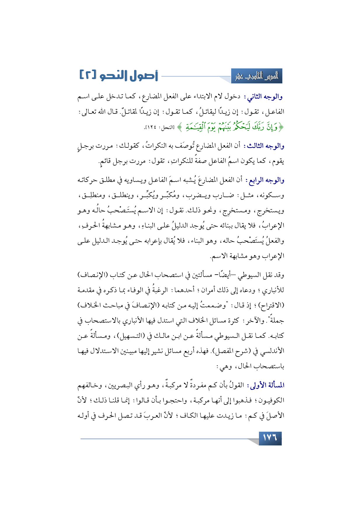 والوجه الثاني: دخول لام الابتداء على الفعل المضارع، كما تدخل على اسم الفاعل، تقول: إن زيدًا ليقاتلُ، كما تقول: إن زيدًا لمقاتلٌ. قال الله تعالى: {وَإِنَّ رَبَّكَ لَيَحْكُمُ بَيْنَهُمْ يَوْمَ الْقِيَامَةِ} (النحل: 124). والوجه الثالث: أن الفعل المضارع تُوصَف به النكراتُ، كقولك: مررت برجلٍ يقوم، كما يكون اسمُ الفاعل صفةً للنكراتِ، تقول: مررت برجل قائمٍ. والوجه الرابع: أن الفعل المضارعَ يُشبه اسمَ الفاعل ويساويه في مطلق حركاته وسكونه، مثل: ضارب ويضرب، ومُكبّر ويُكبِّر، وينطلق، ومنطلِق، ويستخرج، ومستخرِج، ونحو ذلك. نقول: إن الاسم يُستَصْحبُ حالُه وهو الإعرابُ، فلا يقال ببنائه حتى يُوجد الدليلُ على البناءِ، وهو مشابهةُ الحرفِ، والفعلُ يُستَصْحبُ حاله، وهو البناء، فلا يُقال بإعرابه حتى يُوجد الدليل على الإعراب وهو مشابهة الاسم.