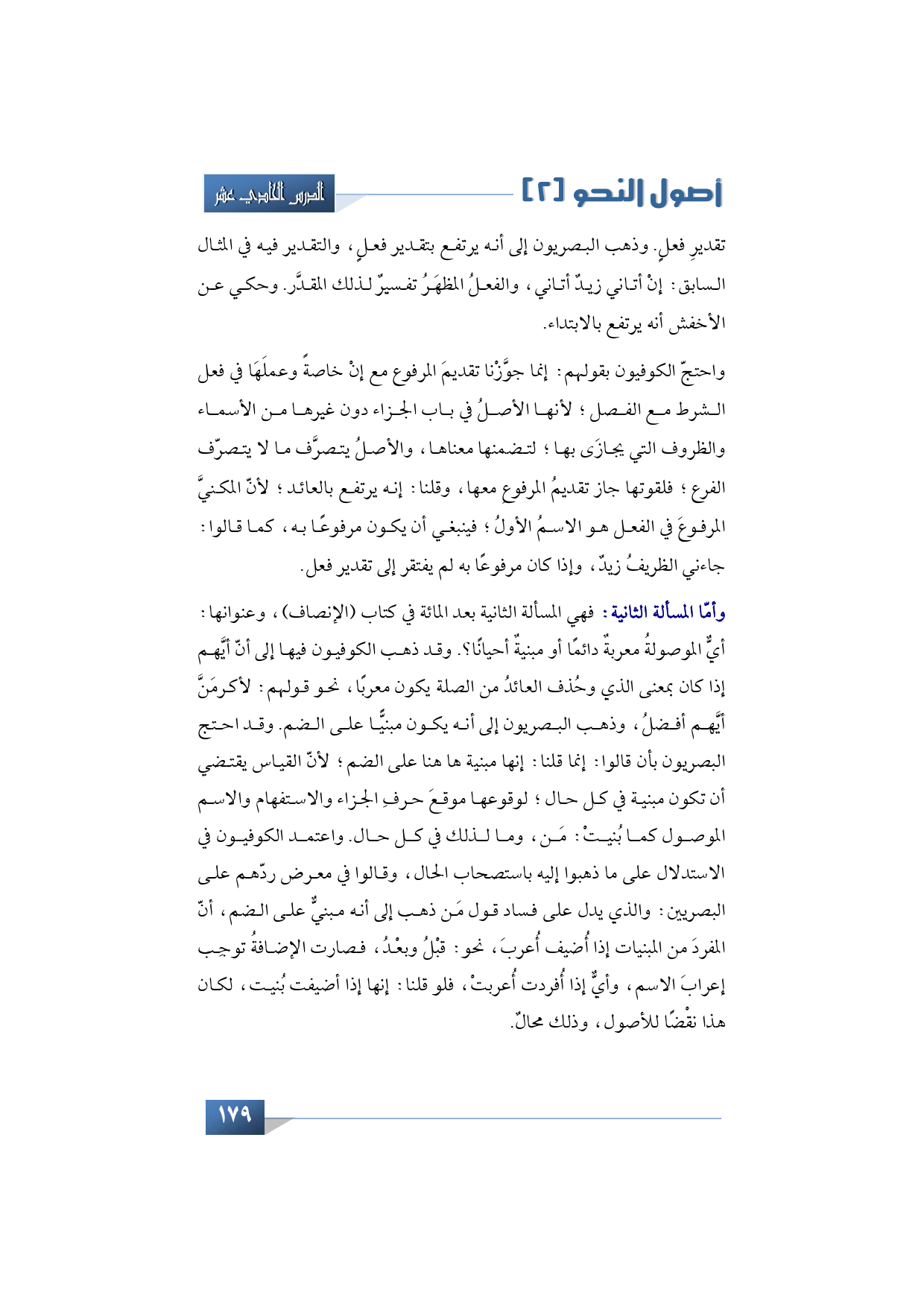 وأمّا المسألة الثانية: فهي المسألة الثانية بعد المائة في كتاب (الإنصاف)، وعنوانها: أيٌّ الموصولةُ معربةٌ دائمًا أو مبنيةٌ أحيانًا؟. وقد ذهب الكوفيون فيها إلى أنّ أيَّهم إذا كان بمعنى الذي وحُذف العائدُ من الصلة يكون معربًا، نحو قولهم: لأكرمَنَّ أيَّهم أفضلُ، وذهب البصريون إلى أنه يكون مبنيًّا على الضم. وقد احتج البصريون بأن قالوا: إنما قلنا: إنها مبنية ها هنا على الضم؛ لأنّ القياس يقتضي أن تكون مبنية في كل حال؛ لوقوعها موقعَ حرفِ الجزاء والاستفهام والاسم الموصول كما بُنيتْ: مَن، وما لذلك في كل حال. واعتمد الكوفيون في الاستدلال على ما ذهبوا إليه باستصحاب الحال، وقالوا في معرض ردّهم على البصريين: والذي يدل على فساد قول مَن ذهب إلى أنه مبنيٌّ على الضم، أنّ المفردَ من المبنيات إذا أُضيف أُعربَ، نحو: قبْلُ وبعْدُ، فصارت الإضافةُ توجِب إعرابَ الاسم، وأيٌّ إذا أُفردت أُعربتْ، فلو قلنا: إنها إذا أضيفت بُنيت، لكان هذا نقْضًا للأصول، وذلك محالٌ.