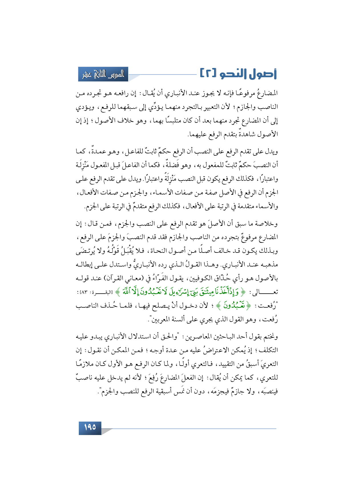 المضارعُ مرفوعًا فإنه لا يجوز عند الأنباري أن يُقال: إن رافعه هو تجرده من الناصب والجازم؛ لأن التعبير بالتجرد منهما يؤدِّي إلى سبقهما للرفع، ويؤدي إلى أن المضارع تجرد منهما بعد أن كان متلبسًا بهما، وهو خلاف الأصول؛ إذ إن الأصول شاهدةٌ بتقدم الرفع عليهما.
