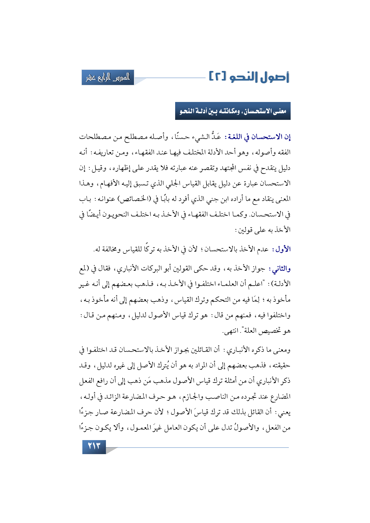 إن الاستحسان في اللغة: عَدُّ الشيء حسنًا، وأصله مصطلح من مصطلحات الفقه وأصوله، وهو أحد الأدلة المختلف فيها عند الفقهاء، ومن تعاريفه: أنه دليل ينقدح في نفس المجتهد وتقصر عنه عبارته فلا يقدر على إظهاره، وقيل: إن الاستحسان عبارة عن دليل يقابل القياس الجلي الذي تسبق إليه الأفهام، وهذا المعنى ينقاد مع ما أراده ابن جني الذي أفرد له بابًا في (الخصائص) عنوانه: باب في الاستحسان. وكما اختلف الفقهاء في الأخذ به اختلف النحويون أيضًا في الأخذ به على قولين؛ الأول: عدم الأخذ بالاستحسان؛ لأن في الأخذ به تركًا للقياس ومخالفة له. والثاني: جواز الأخذ به، وقد حكى القولين أبو البركات الأنباري، فقال في (لمع الأدلة): "اعلم أن العلماء اختلفوا في الأخذ به، فذهب بعضهم إلى أنه غير مأخوذ به؛ لِمَا فيه من التحكم وترك القياس، وذهب بعضهم إلى أنه مأخوذ به، واختلفوا فيه، فمنهم من قال: هو ترك قياس الأصول لدليل، ومنهم من قال: هو تخصيص العلة"، انتهى.