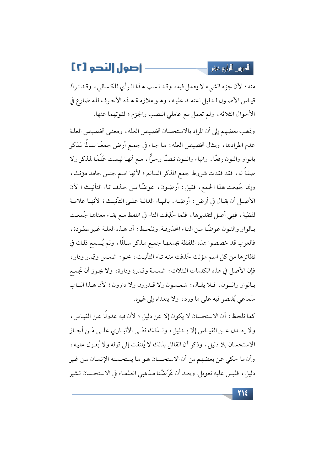 وذهب بعضهم إلى أن المراد بالاستحسان تخصيص العلة، ومعنى تخصيص العلة عدم اطرادها، ومثال تخصيص العلة: ما جاء في جمع أرض جمعًا سالمًا لمذكر بالواو والنون رفعًا، والياء والنون نصبًا وجرًّا، مع أنها ليست عَلَمًا لمذكر ولا صفةً له، فقد فقدت شروط جمع المذكر السالم؛ لأنها اسم جنس جامد مؤنث، وإنما جُمِعت هذا الجمع، فقيل: أرضون، عوضًا من حذف تاء التأنيث؛ لأن الأصل أن يقال في أرض: أرضة، بالهاء الدالة على التأنيث؛ لأنها علامة لفظية، فهي أصل لتقديرها، فلما حُذِفت التاء في اللفظ مع بقاء معناها جُمعت بالواو والنون عوضًا من التاء المحذوفة. ونلحظ: أن هذه العلة غير مطردة، فالعرب قد خصصوا هذه اللفظة بجمعها جمع مذكر سالمًا، ولم يُسمع ذلك في نظائرها من كل اسم مؤنث حُذفت منه تاء التأنيث، نحو: شمس وقِدر ودار، فإن الأصل في هذه الكلمات الثلاث: شمسة وقدرة ودارة، ولا يجوز أن تجمع بالواو والنون، فلا يقال: شمسون ولا قدرون ولا دارون؛ لأن هذا الباب سَماعي يُقتصر فيه على ما ورد، ولا يتعداه إلى غيره.