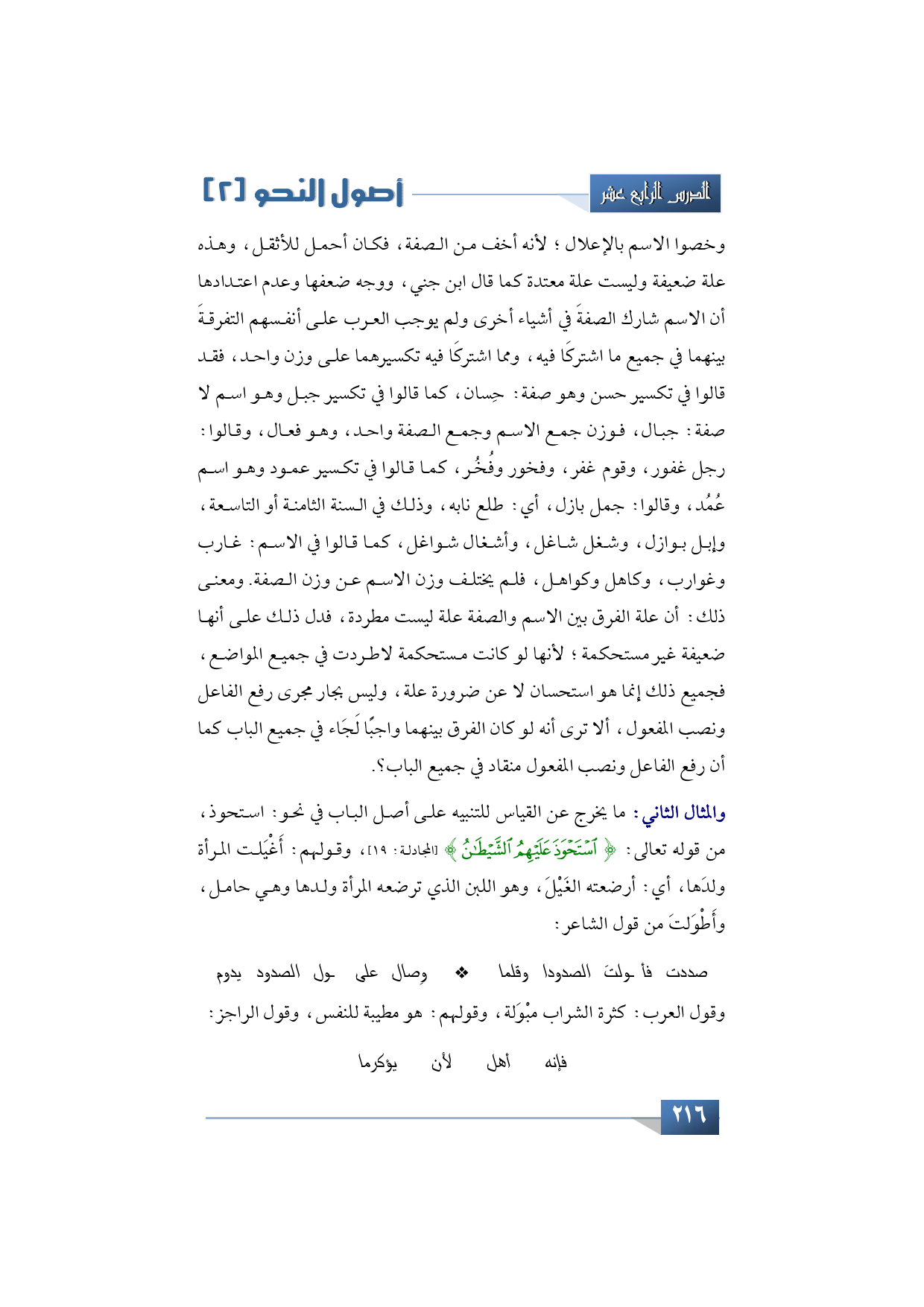 وخصوا الاسم بالإعلال؛ لأنه أخف من الصفة، فكان أحمل للأثقل، وهذه علة ضعيفة وليست علة معتدة كما قال ابن جني، ووجه ضعفها وعدم اعتدادها أن الاسم شارك الصفةَ في أشياء أخرى ولم يوجب العرب على أنفسهم التفرقةَ بينهما في جميع ما اشتركَا فيه، ومما اشتركَا فيه تكسيرهما على وزن واحد، فقد قالوا في تكسير حسن وهو صفة: حِسان، كما قالوا في تكسير جبل وهو اسم لا صفة: جبال، فوزن جمع الاسم وجمع الصفة واحد، وهو فعال، وقالوا: رجل غفور، وقوم غفر، وفخور وفُخُر، كما قالوا في تكسير عمود وهو اسم عُمُد، وقالوا: جمل بازل، أي: طلع نابه، وذلك في السنة الثامنة أو التاسعة، وإبل بوازل، وشغل شاغل، وأشغال شواغل، كما قالوا في الاسم: غارب وغوارب، وكاهل وكواهل، فلم يختلف وزن الاسم عن وزن الصفة. ومعنى ذلك: أن علة الفرق بين الاسم والصفة علة ليست مطردة، فدل ذلك على أنها ضعيفة غير مستحكمة؛ لأنها لو كانت مستحكمة لاطردت في جميع المواضع، فجميع ذلك إنما هو استحسان لا عن ضرورة علة، وليس بجار مجرى رفع الفاعل ونصب المفعول، ألا ترى أنه لو كان الفرق بينهما واجبًا لَجَاء في جميع الباب كما أن رفع الفاعل ونصب المفعول منقاد في جميع الباب؟.